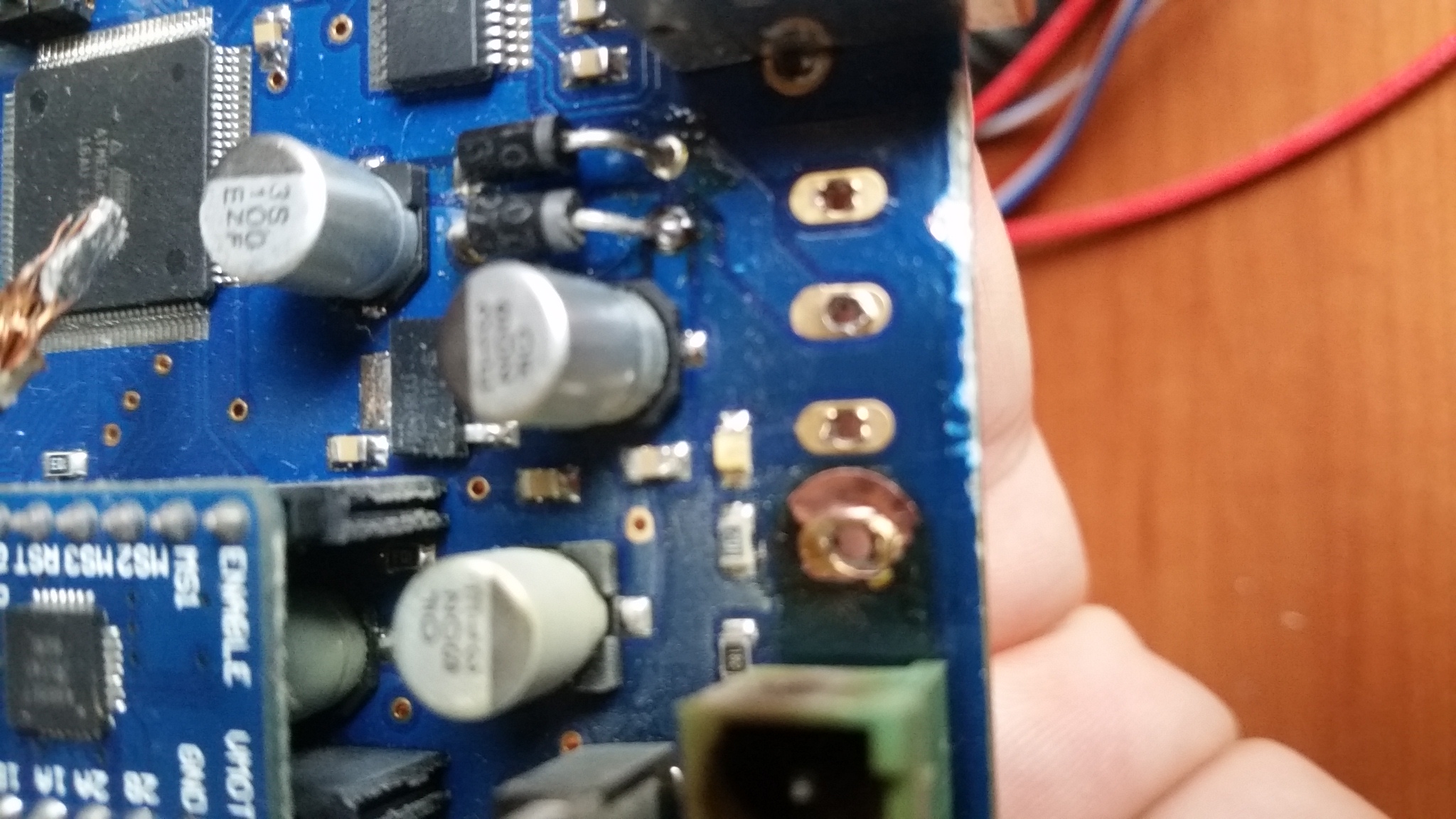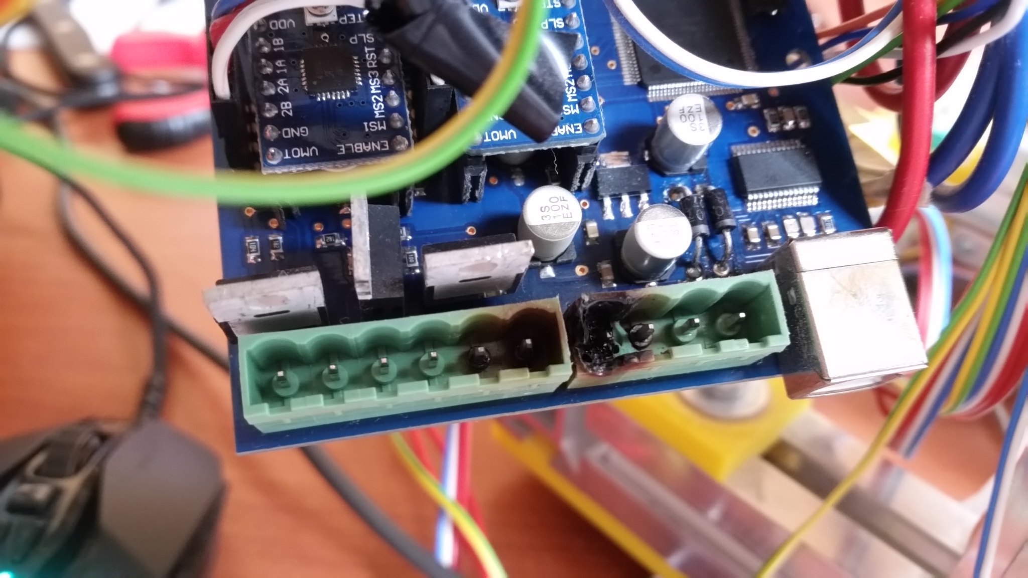Odpálené kolečko je plošný spoj. Bohužel z fotografií není poznat zda spoj vede po té straně kde kolečko chybí nebo ne. Prostě musíte zajistit spojení vývodu té svorkovnice se součástkou ke které plošný spoj vede. Pokud už je spoj přetržený doporučil bych ho nahradit kusem měděného drátu většího průžezu. To se ostatně doporučuje i u nepoškozených desek. Spoje na těch čínských deskách bývají ošizené a na spojích jsou zbytečné ztráty. Takče je dobré silové spoje posílit drátem. Ale Vy máte jinou desku než já a spoje pod maskou není na fotografiích vidět. Takže se mohu mýlit a spoje máte dimenzované dostatečně.
