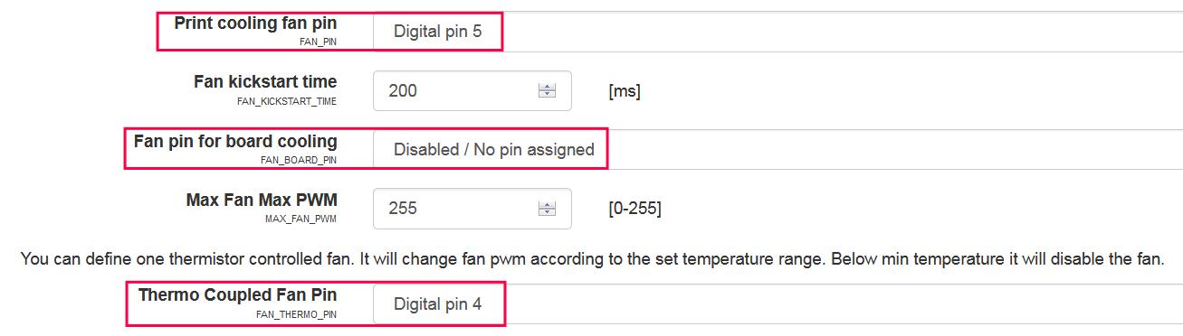 tom666 píše:Chose píše:... mám na hlavě hotendů veltilátory 3 (jeden pro filament a dva spřažené pro chlazení vrstev výtisku). Ventilátor chlazení filamentu je závislý na teplotě hotendu, a druhé bych chtěl řídit pro zvyšování chlazení při mostování-lze to?