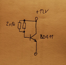 12V a 2,25A dalo ztratu bratru 27W, baze pripojena pres 2x1k odpor tj. 500R, ubytek napeti na rezistorech cca 11,5V coz odpovida ztrate zhruba 0,26W, tj. 2ks paralelne klasickych R vyhovuji.