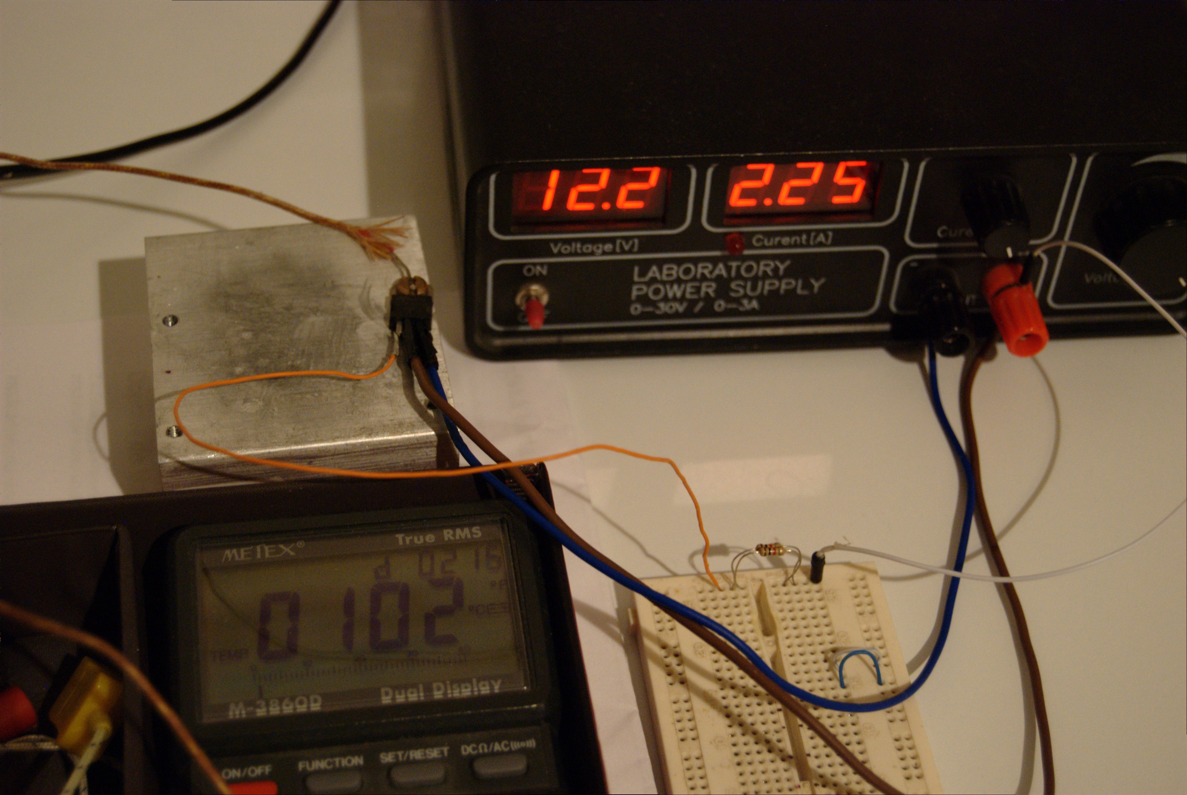 Na tranzistor jsem pouzil velky chladic na CPU, otepleni na 100st.C za cca 10min. Pokud to nekomu pomuze, budu rad. :)