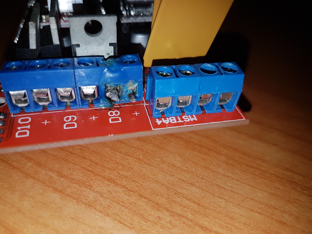 No to me dost vylekalo tak jsem vymenil zdroj za 24V/15A upravil ramps na 24V, takze motory, ohrev jede na 24V a pro arduino DC/DC dela 12V. Vetrak rizeny pres PWM jsem vyresil na prasaka 100ohm/5W odporem.