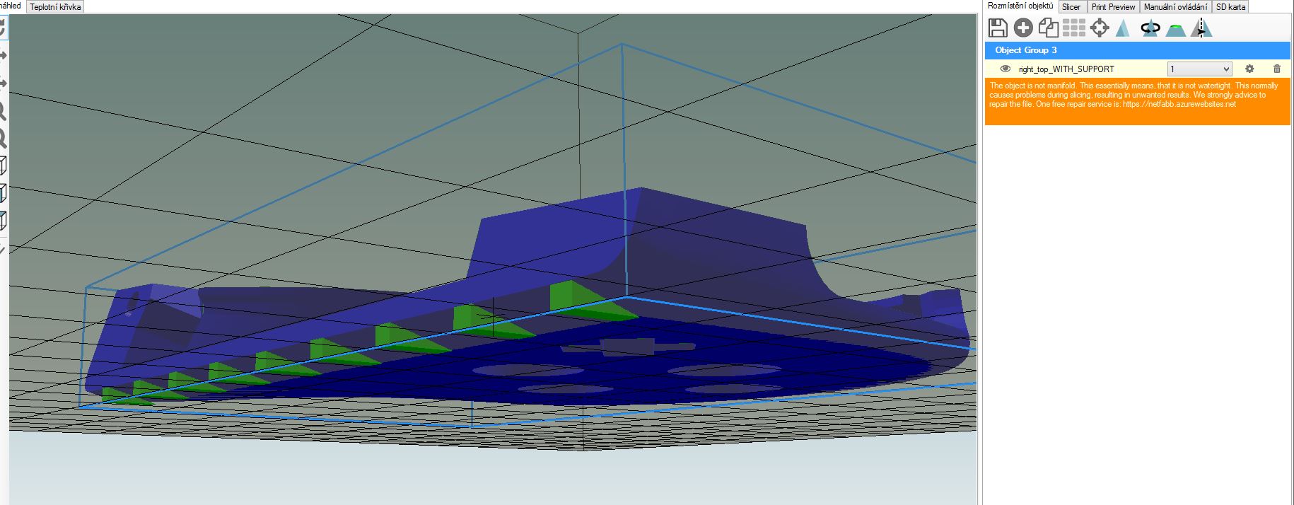 Ono to je v tom okynku napsany. Stahni si Netfabb studio Basic, model v nem otevri a pouzij opravu. V te Basic verzi nejdou vsecky, ale vetsinou to staci a zbytek (Opravit normaly) se da vetsinou primo v Repetieru, pod tou ikonkou ozubenyho kolecka u modelu v seznamu v pravo.