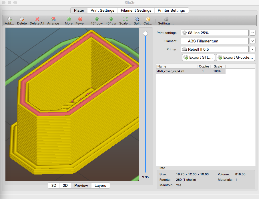 Slic3r 1.2.9 jsem vyřadil a vrátil se zpět, přeplňuje stěny kde mám 3 primery ( v prostředním perimetru cpe hodně materiály a chová se divně. Občas spadně, když generuju 2x stejný objěkt vyjde z toho jiný gcode.