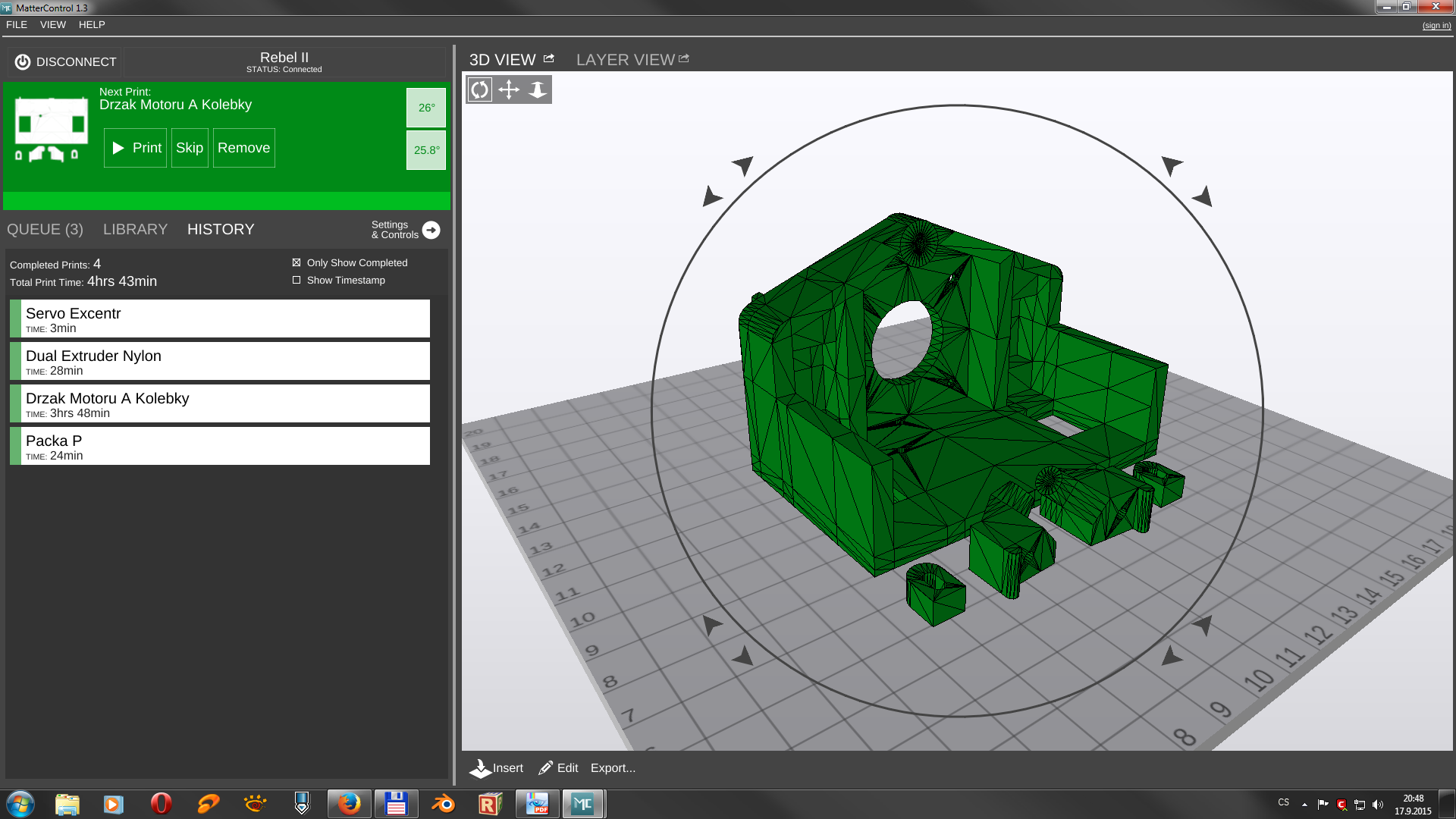 Asi nehlavnější část je řádka kde je QUEUE, LIBRARY, HISTORY a Settings & Controls. QUEUE je záložka, kde máte co chcete tisknout, LIBRARY je knihovna (jak jinak :D ) kam si můžete uložit všechny tisky pro budoucí tisknutí. Ukládá se jak rozmístění dílů, tak i gcode a snad i použitý profil nastavení sliceru (tím si nejsem jist, zatím používám jenom jeden). Stačí na danou položku najet myší, objeví se tlačítka View a Print a kliknout na Print a hned se vám daná položka přesune do QUEUE se vším všudy a stisknete Print.