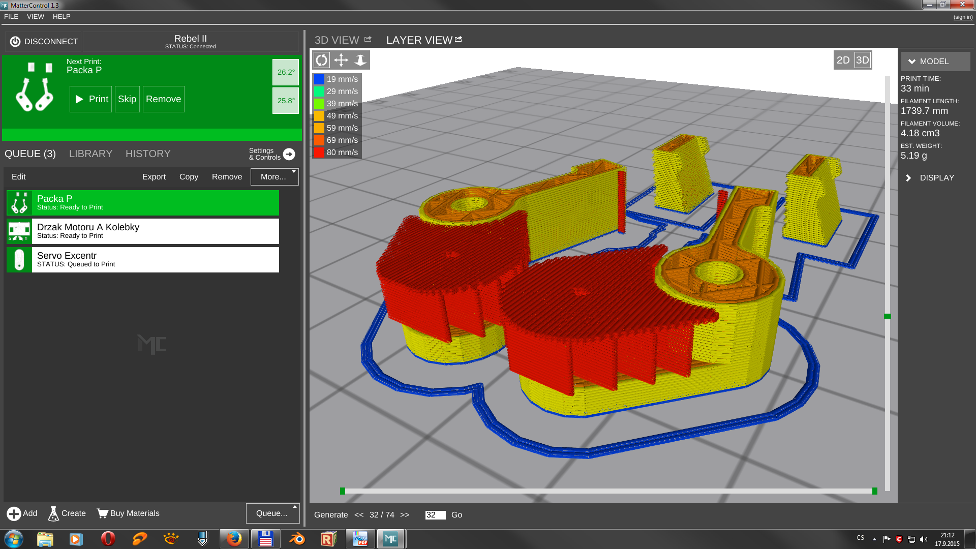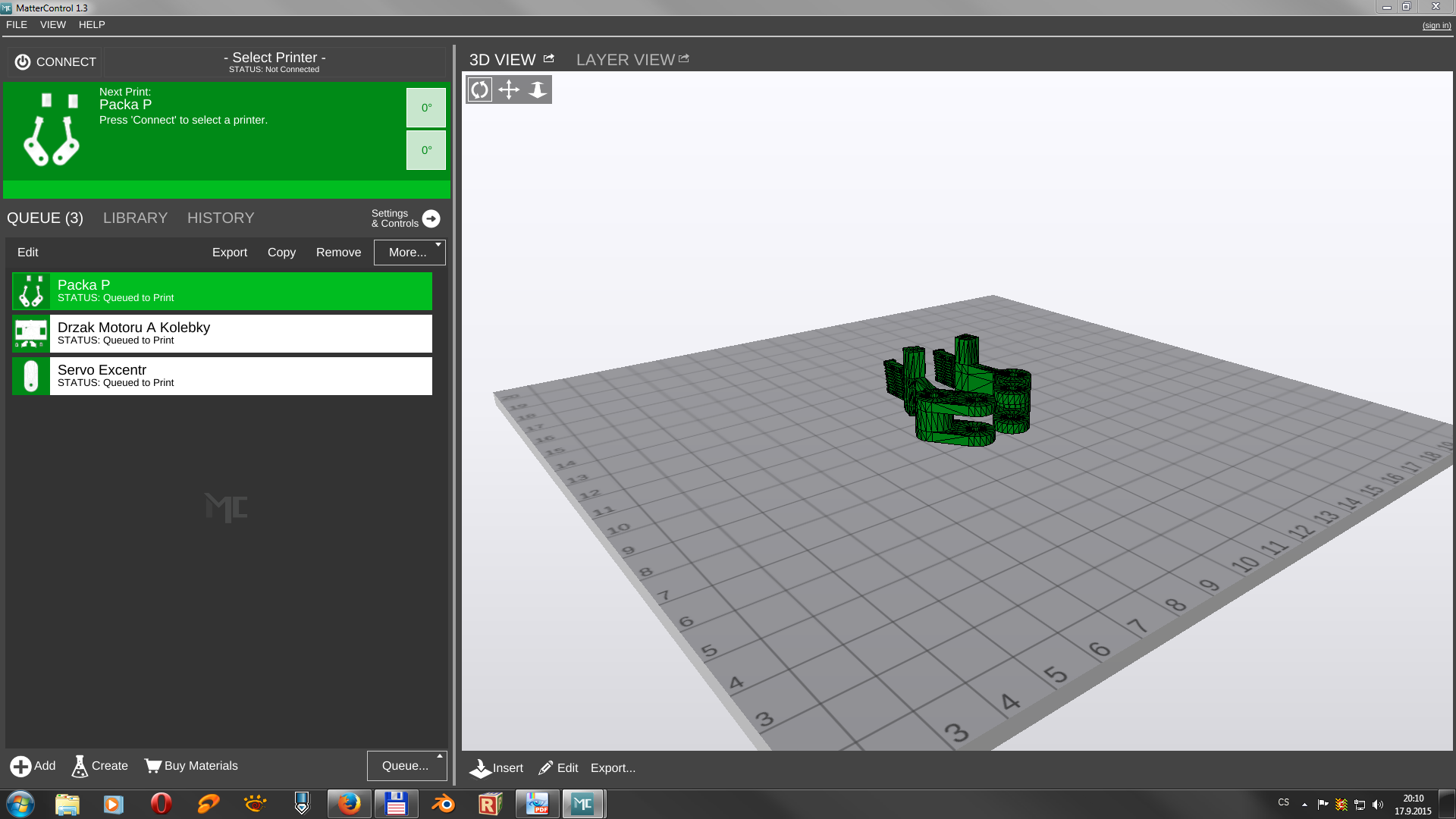 Asi nehlavnější část je řádka kde je QUEUE, LIBRARY, HISTORY a Settings & Controls. QUEUE je záložka, kde máte co chcete tisknout, LIBRARY je knihovna (jak jinak :D ) kam si můžete uložit všechny tisky pro budoucí tisknutí. Ukládá se jak rozmístění dílů, tak i gcode a snad i použitý profil nastavení sliceru (tím si nejsem jist, zatím používám jenom jeden). Stačí na danou položku najet myší, objeví se tlačítka View a Print a kliknout na Print a hned se vám daná položka přesune do QUEUE se vším všudy a stisknete Print.