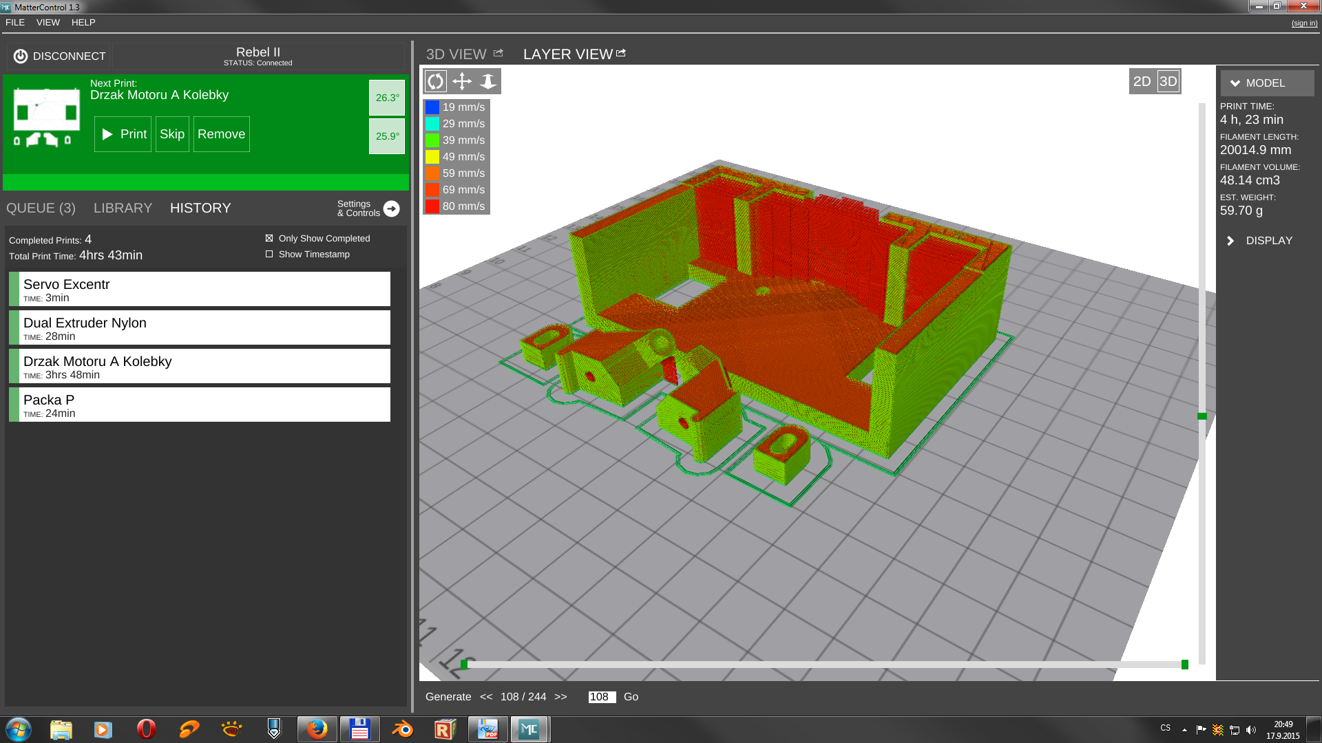 Další je HISTORY, kde se vám zobrazí už provedené tisky s časem, jak dlouho běžely. Jinak abych nezapomněl doba tisku je zde vypočtena o něco delší než pak ve skutečnosti je, třeba mě u jednoho ukazuje 4h 23min a samotný tisk pak trval 3h 48min (nikde jsem zatím nenašel kalibraci jako je u Repetiera)