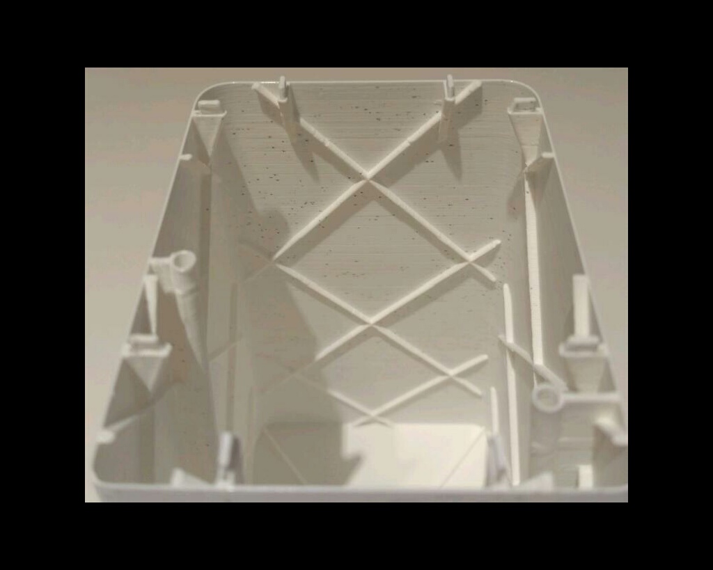 Napadá mně jen kousek spáleného plastu na trysce co se pravidelně uvolňuje a díky tomu že přejezdy jsou jen vnitřkem tak je to vidět jen uvnitř. Řešení je v trysce či seřízení tisku.