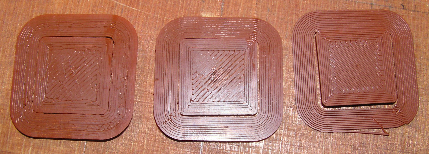 Pro porovnání jsem vytisknul ještě dva vzorky, ten vlevo má pomocí G92 Z0.1 nastavenu počáteční mezeru o desetinu menší (dělají se ta střeva) a ten vpravo pomocí G92 Z-0.1 mezeru o desetinu větší (prakticky nedrží na bedu).