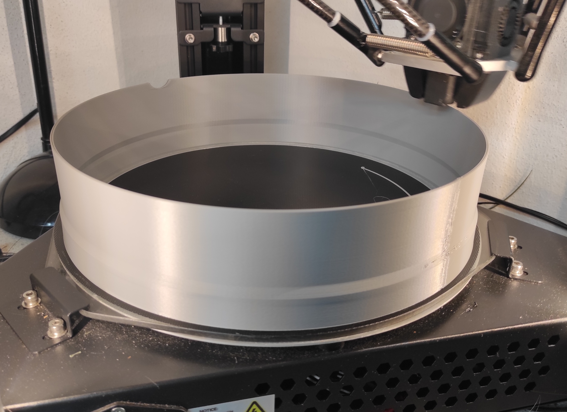 Průměr 260, výška 110, síla stěny 1.6. Výška vrstvy 0,24, rychlost tisku 120, teplota 245, bed 70. Slicováno v Cuře bez arc welderu. Materiál šedá PET-G Devil Design, doba tisku 3:35.