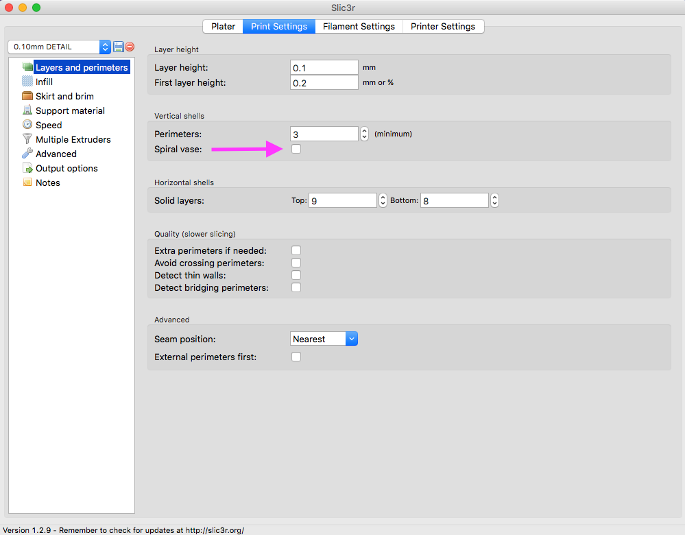 Ve Slic3r je zaškrtávátko v print settings "spiral vase", pak ti to tiskne jen stěnu a případně dno (záleží na tvaru modelu a nastavení solid layers)