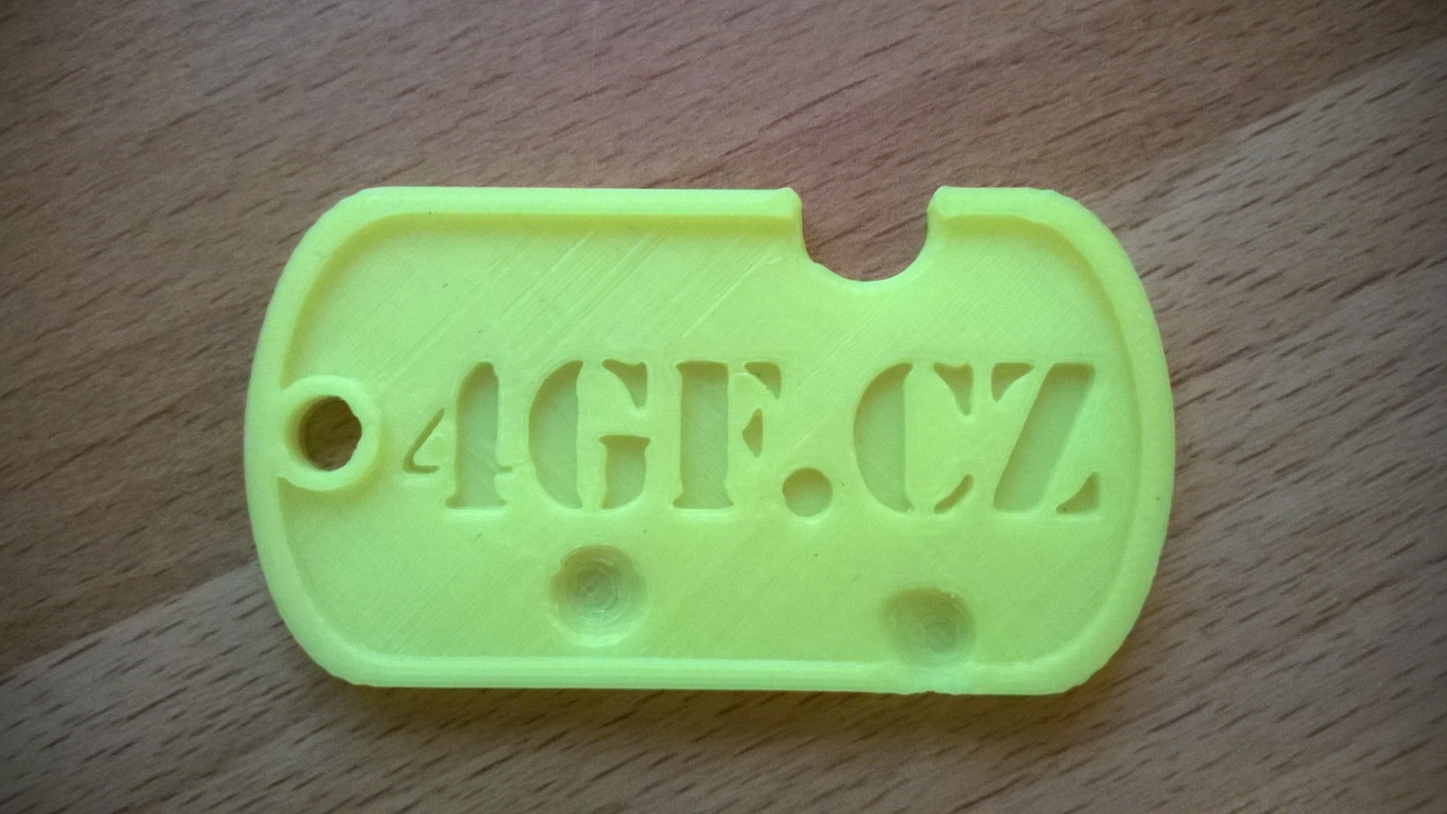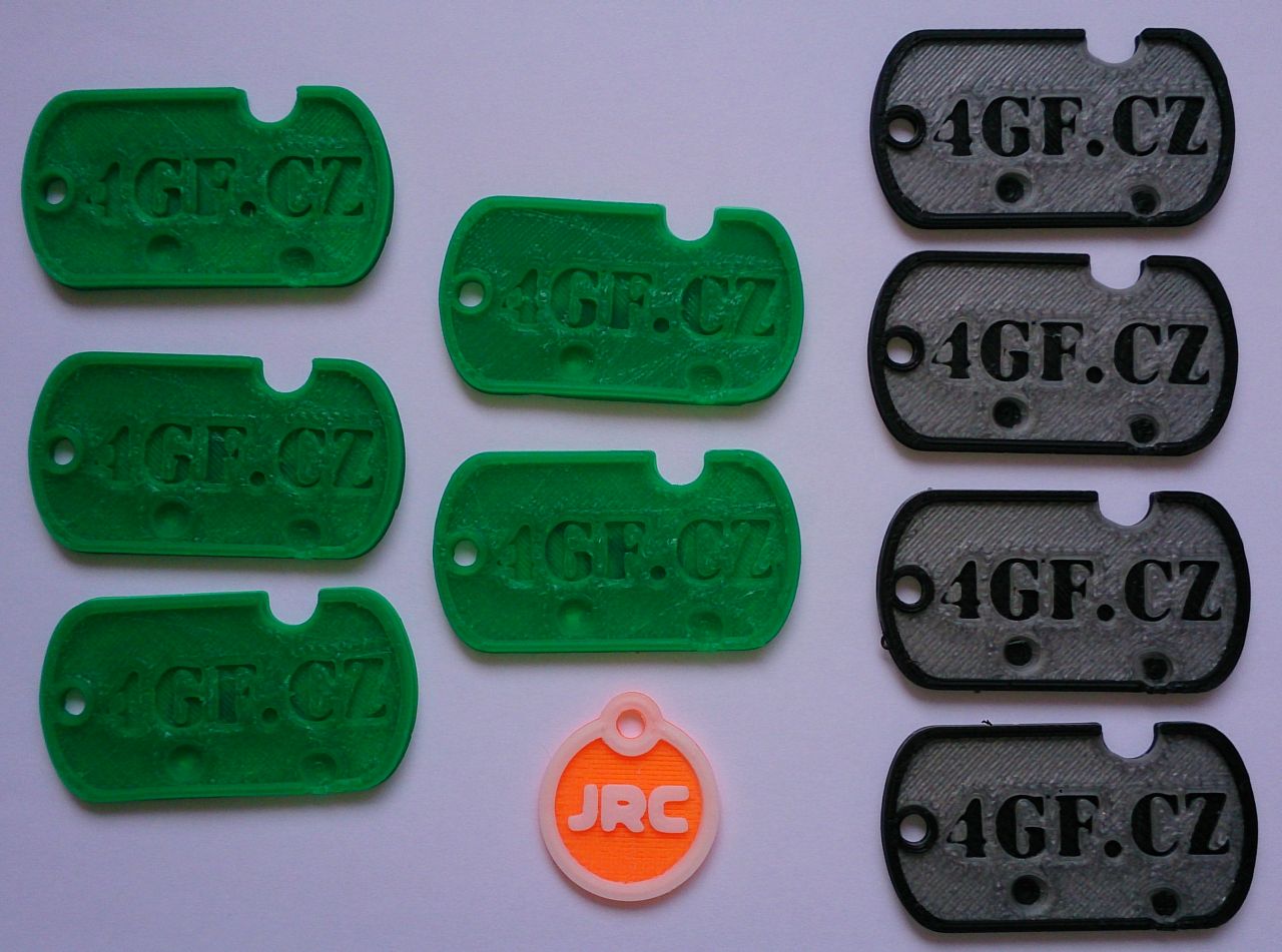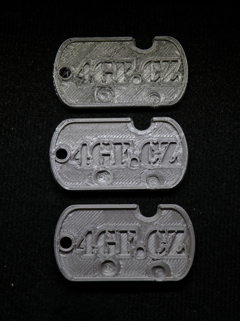 Přikládám ukázku těch psích známek, jak šly nám. Vrchní je Mladeč 3mm - zmetek (jeden z těch lepších, co mi tady zbyl) z jedné várky tisku, občas to takhle zasoplilo, výplně to dělalo ale přesto na pohled porézní, když jsme zvýšili dávkování nebo teplotu, zasekával se. Druhý je 3DF 1,75mm - tisk na default slicer profil, teplota 200st. a rychlost zvýšená na 200% (tzn. 60mm/120mm). Třetí je taky 3DF - tisk na 190st. a default profil 30/60.