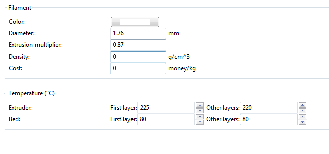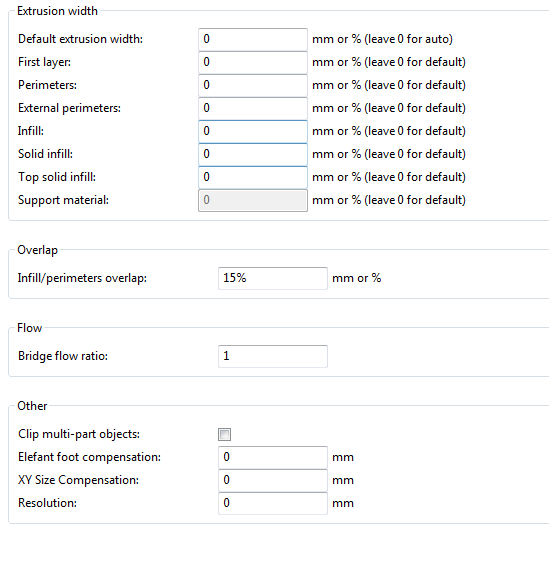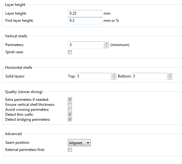Ahoj, přes Vánoce jsem dostavěl Rebelixe a postupně jsem kalibroval. Pohyby všech os jsou v pořádku - posouval jsem ručně přes Repetier a měřil o kolik se pohnuly. Materiálu si to také bere správně (měřeno kolik ho zaleze do extruderu), vytiskl jsem i objekt s jedním perimetrem a změřil jeho tloušťku v poslední vrstvě - při nastavení Slic3ru podle obrázku jsem naměřil 0,49mm, to mi přijde OK. Řeším ale potíž s výškou objektu v ose Z. Všechny objekty jsou trochu nižší než mají být. Díra vlevo na výtisku má být kulatá, ale v ose Z jí chybí několik desetin mm. Rozměry v osách X a Y sedí na setiny mm.