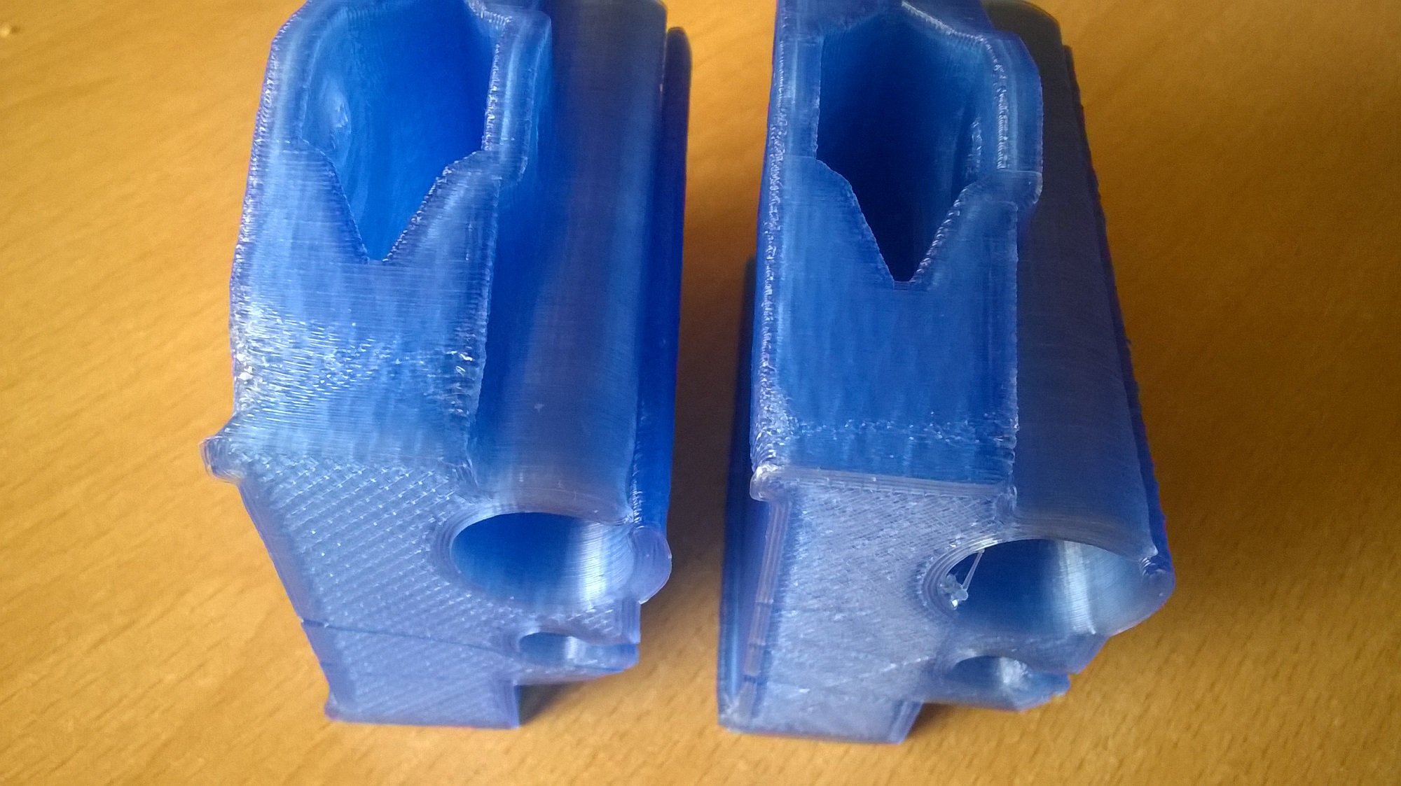 První pokus nedržel téměř vůbec, rozlámu jej skoro rukou. Proto jsem u druhého zvedl teplotu podle mnoha příspěvků zde na fóru a i výplň. Už to tolik nepraská, je to pevnější, ale přesto je to puklé. Taky je ale vidět, že ve spodní části pravého pojezdu je to víc přepálené. Poradíte prosím, co s tím? Mohl byste mi někdo prosím poslat gcode obou Zetových pojezdů, pokud jste tiskli ze stejného materiálu a vše bylo OK a ještě tento kód máte? Pokud by vše bylo OK, prošel bych si ten kód a nastavil dle něj parametry. Z ABS to nemám odvahu vůbec tisknout. Nebo doporučíte jiný materiál? Díky za každou radu.