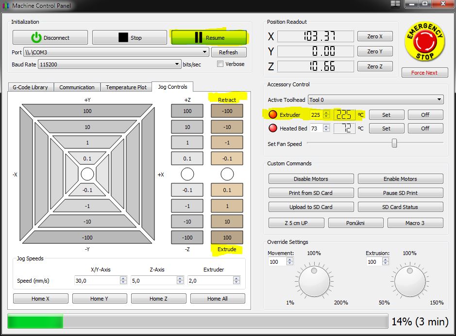 2. Vygenerujte g-code a klasicky spustite tlač. Pri dosiahnutí začiatku požadovanej vrstvy sa tlač zastaví a ozve zvukový signál, bed sa následne odsunie v osi y. Zastavenie tlače v Simplify3D potvrďte kliknutím na OK. Výmenu filamentu vykonajte ručne za pomoci funkcií v Jog Controls. Vyhrievanie extruderu a bedu zostáva zapnuté, aby ste mohli vymeniť filament a následne hneď pokračovať bez rizika odlepenia výtlačku z dôvodu poklesu teploty bedu.