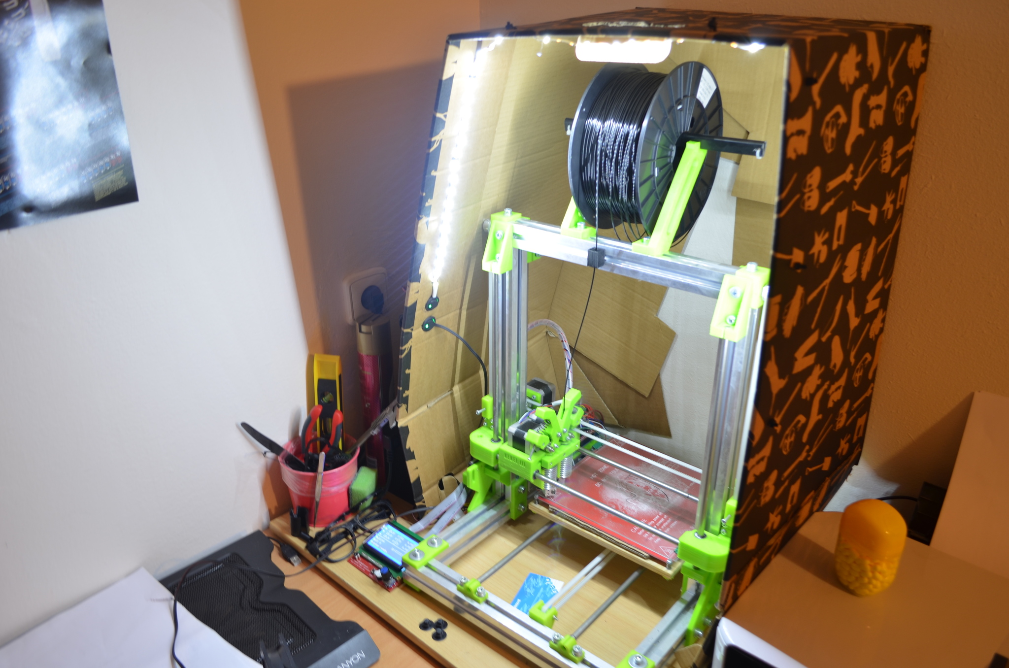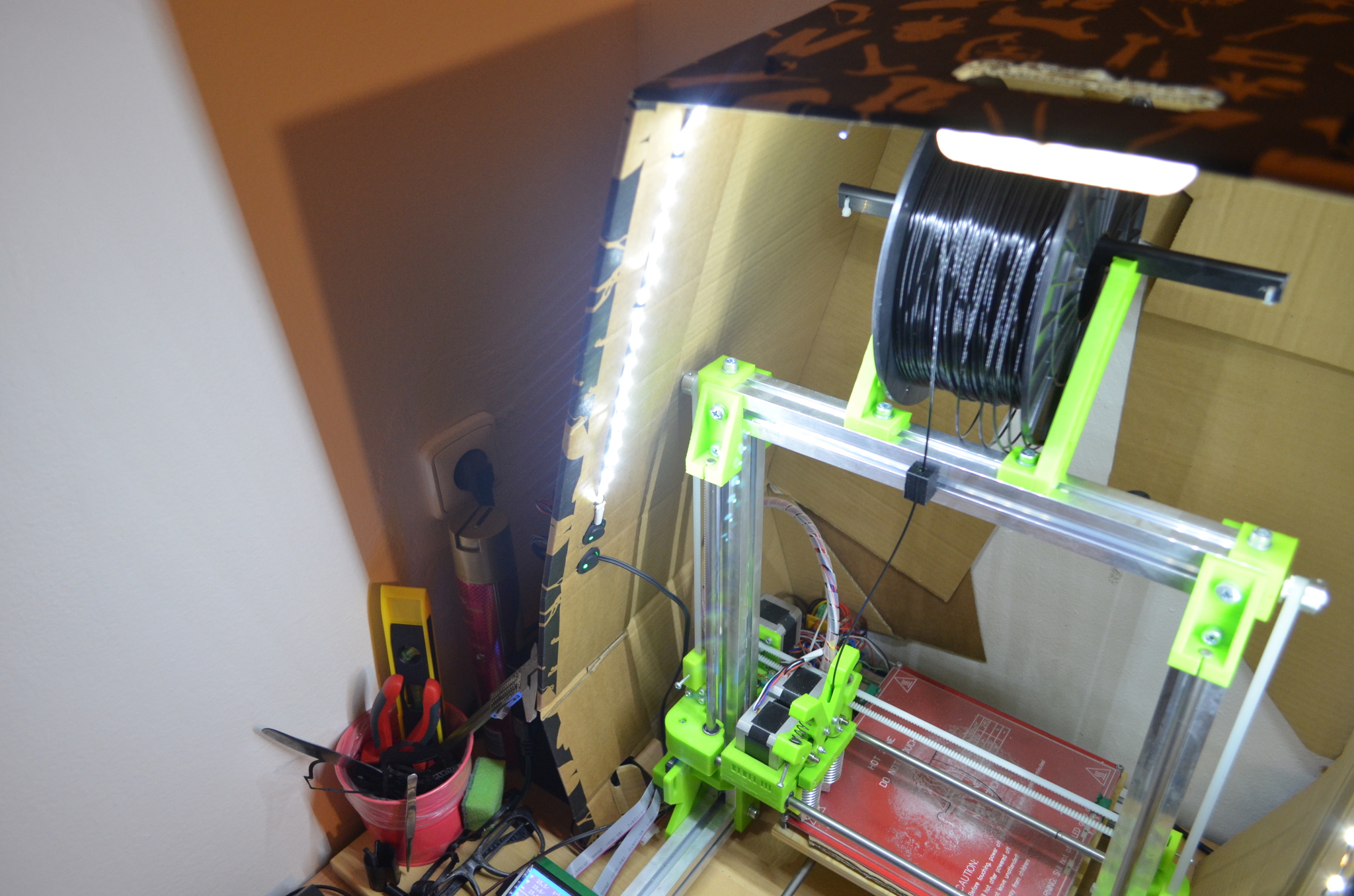 Taky nechci rejpat, ale též bych byl opatrný. Ideální mi na box na tiskárnu přijde sádrokarton. Je to nehořlavé, laciné, hezky to vypadá a skvěle opracovává.