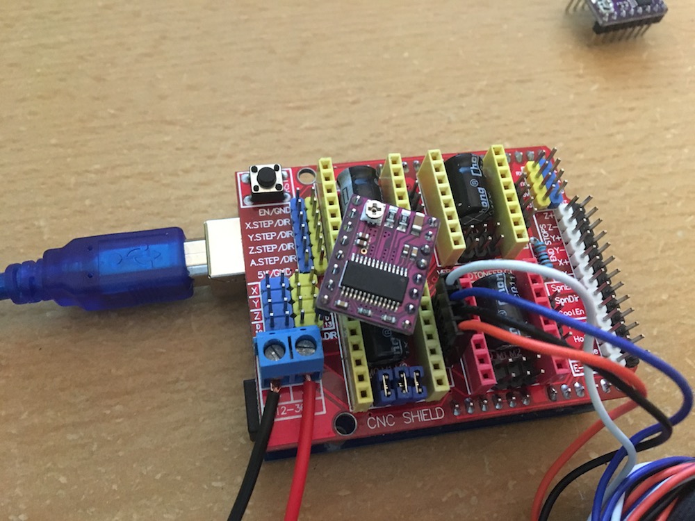 Ahoj, do budoucna plánuji stavbu Rebela 2 tak jsem se rozhodl že začnu s elektronikou. V úterý mi dorazily součástky z Ali a od té doby se mi ještě nepovedlo pohnout s motorem ani o krok. Používám Arduino UNO a CNC shield s driverem DRV8825. Do arduina jsem nahrál GRBL 1.1e. Na ovládání z PC používám Universal Gcode Sender. Zapojení je vidět na obrázku. Budu rád za každou pomoc a po týdnu neúspěchu se nedá říct že bych si byl zrovna moc sebejistý  :? .