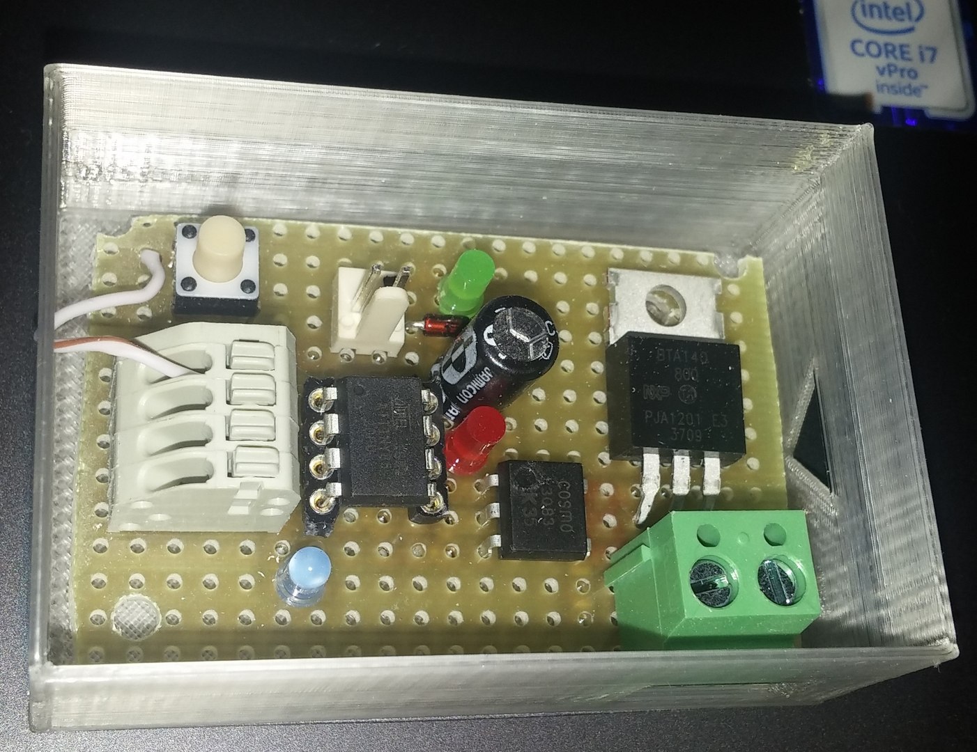 Pres vikend jsem si postavil trochu jine reseni. Je to nezavisly sledovac otaceni civky s filamentem. Pokud se civka prestane otacet, privod 230V pro napajeni tiskarny se vypne. Je to jakysi "hlidaci pes" (watchdog), sledujici pulsy z otaceni civky. Jeden puls za otacku civky. Do civky je strceny maly drzacek s neodymovym magnetem (5 mm). Do drzaku civky pak pridan "reed kontakt". (Podobne snimani otacek/rychlosti pouziva napr. cyklo-kompik - tachometr na kolo). Signal jde do elektroniky - maly 8mi pinovy Atmel ATtiny85, oveseny indikacnimi LEDkami a optotriakem MOC3083 + triakem BTA140 jako silovym spinacem 230 V.