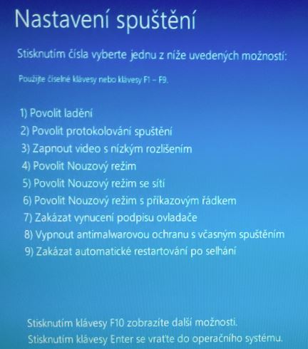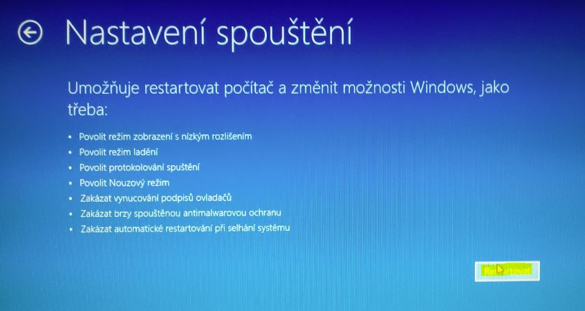 Nastaveni spousteni nas informuje co bude mozne vybrat nas zajima zakaz vynucovani podpisu ovladacu, tlacitkem restartovat se pocitac opravdu restartuje
