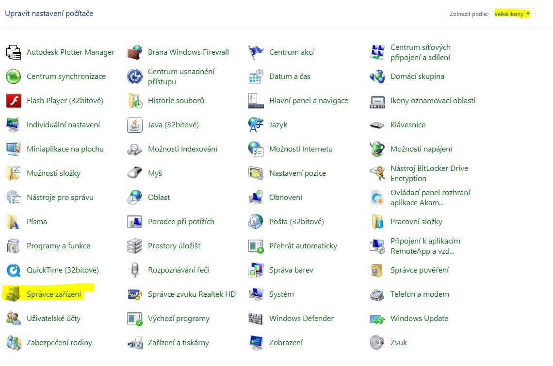 Nyni zvolime v pravo nastaveni a ovladaci panely v nich spravce zarizeni, pokud jej nevidime zvolte v pravo nahore velke ikony