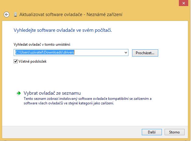 Vybereme cestu kam jsme si ovladac ulozili staci jen po adresar driver tak aby se to vepsalo takto do cesty a zvolime dalsi