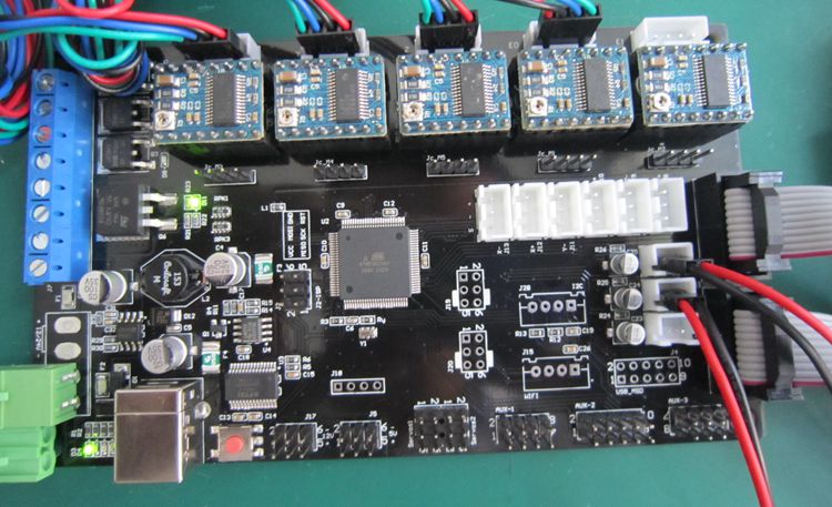 Ma integrovany presnejsie spolu Ramps1.4/Mega2560, ale ma aj integrovany vystup na sd kartu a GLCD (ktomu sa este vratim), 5 vyvod pre motorov (kazdy ma len jeden vystup), Endstopy min a max pre vsetky osy, termistory pre podlozku aj pre dvoch tryskach. ma zvlast Fan vyvod aj dve vyvody pre tryskach