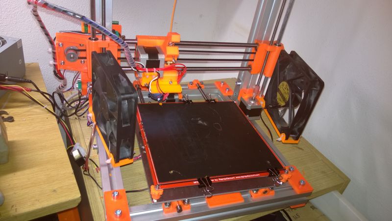 Na rady zdejsich tiskaru jsem zacal ofukovat tisk vetrackama. nasel sem dva 12cm vetracky z pc zdroju. Pripojeny je mam na 5V ze zdroje, foukaji tak akorat zadnej ficak. drzak mam prisroubovany na Z-ovych motorech pres drzak motoru delsim sroubkem. prichyceny je mam stahovacima paskama ale da se pouzit i sroubek M3x35.