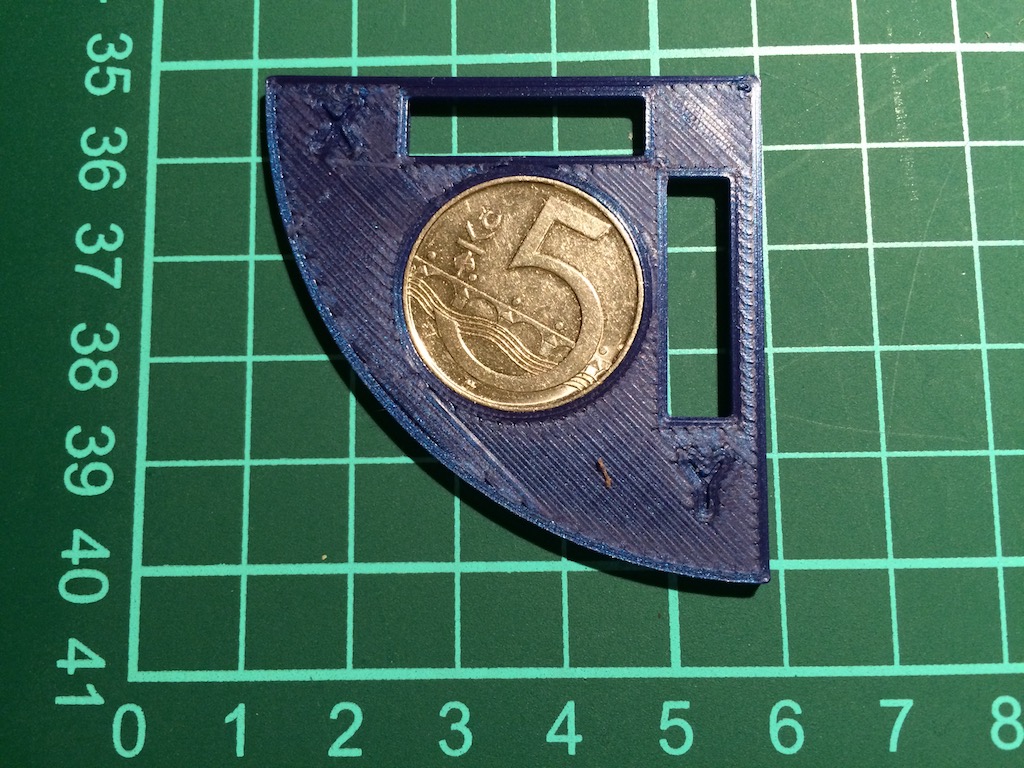 Kde by mohla být chyba? Vytiskl jsem přípravek a vnější rozměr byl 48mm, přesto 5-ti koruna neprošla. Přepočítal jsem tedy kroky a při následném tisku sice mince těsně projde, ale zároveň se samozřejmě zvětšil i vnější rozměr.