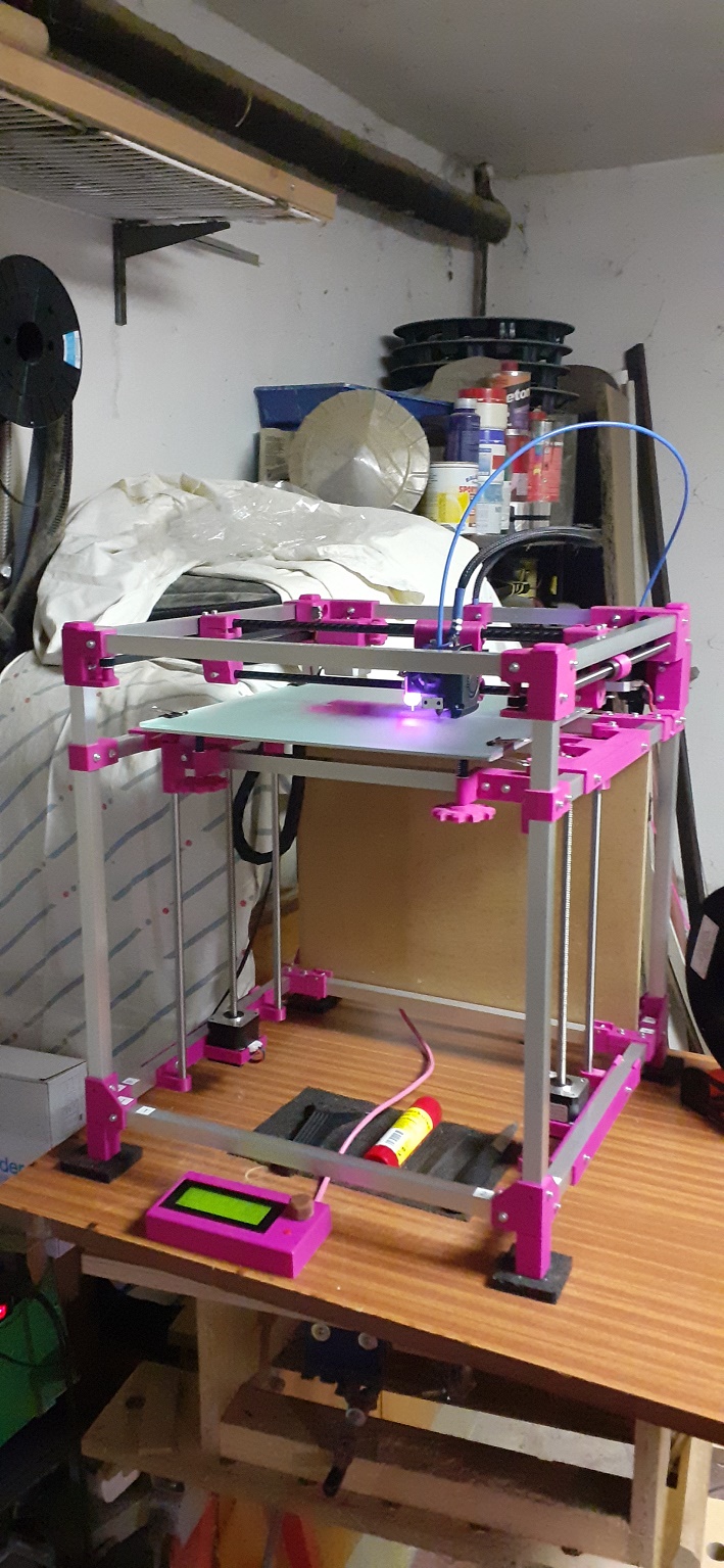Dal jsem dohromady trochu větší a trochu rychlejší CoreYX kostku. Ve vedení řemenů jsem se inspiroval u Vorona 0.1, použil jsem "dospělé" Nema 17 motory 17HS4401, na Z dva integrované trapézy a BMG klon s pancake 23mm motorem. Hotend je CR10. Podložka vyhřívaná 310x310, 24V/360W zdroj, deska Creality 4.2.7. Na videích je ještě pokusná verze s 1.1.4 obyčejnou enderáckou deskou, ale i tak to bylo schopný tisknout dost rychle a dost pěkně. Hranice byla někde na 140mm/s, kdy už deska přestávala stíhat a zasekávalo se to. 100mm/s bez problémů.