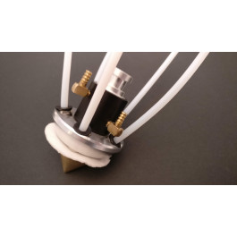 Ten válec je uprostřed dutý na protažení drátů, pod ním není omotávka, ale tepelný oddělovač horké mosazné hlavy od hliníkového chladícího bloku. Pohromadě to drží těch 5 nahoře chlazených "heatbreaků" po stranách kterými prochází struny.