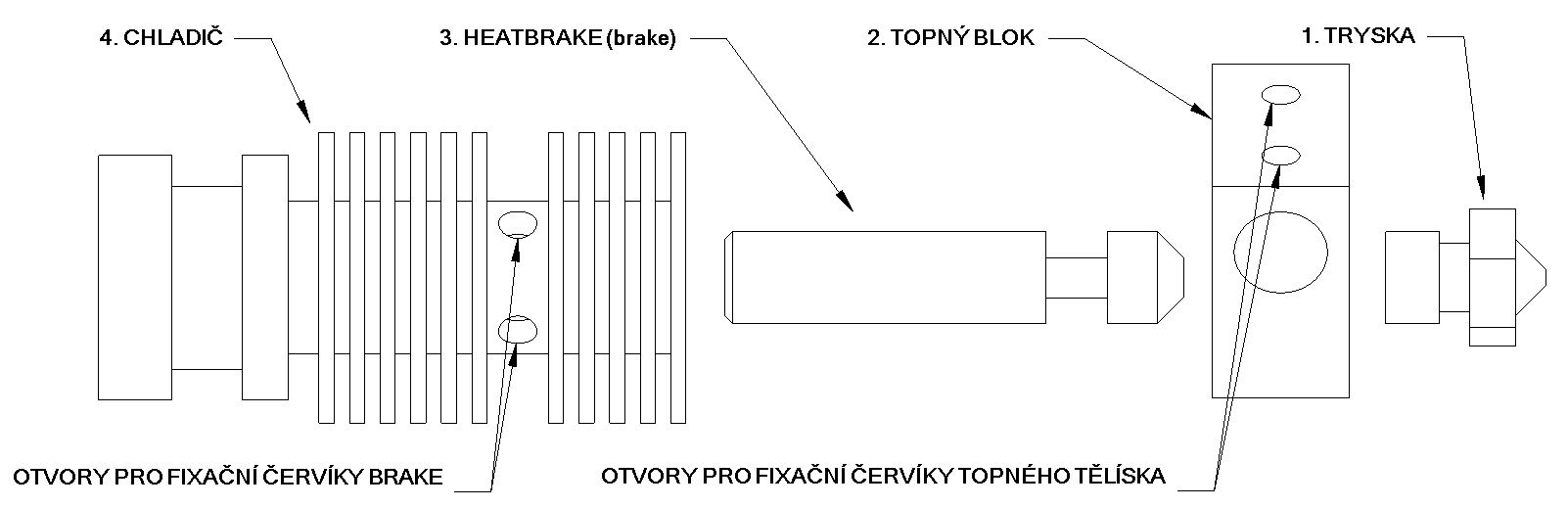 1. Zašroubujte TRYSKU do TOPNÉHO BLOKU. Rukou ji dotáhněte a o půl otáčky pak povolte. Dírka pro termistor by měla být blíže k trysce, ale je odzkoušeno, že může být i opačně.