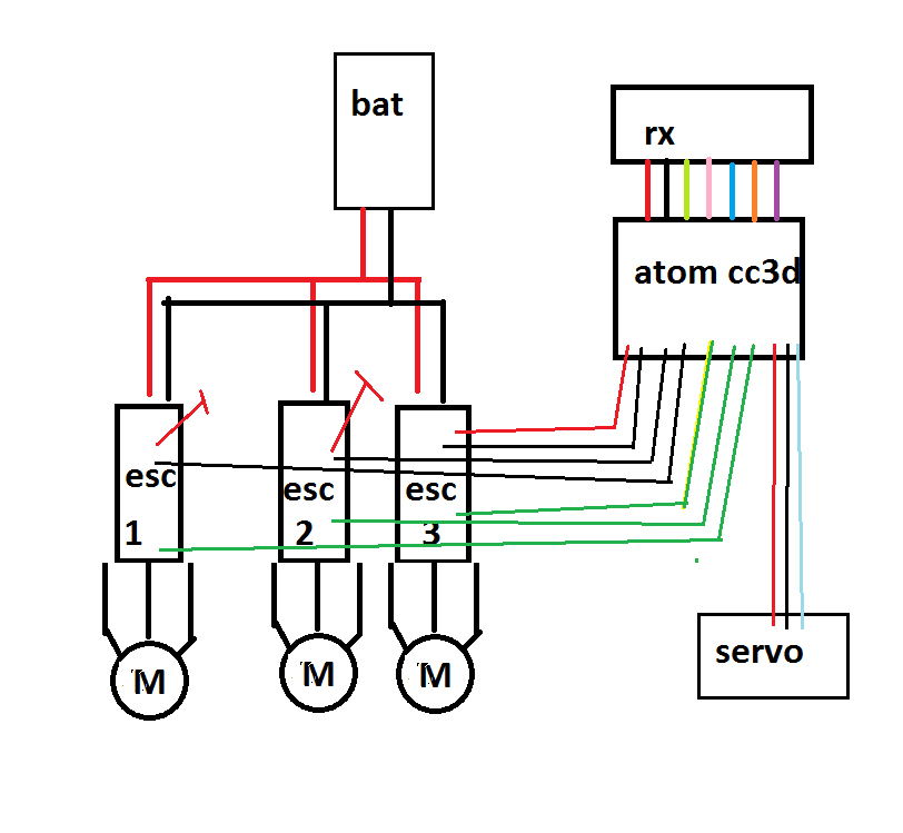 napájení regulátorů spojit. od jednoho regulátoru využít BEC pro napájení příjmače,serva a řídící jednotky. Já jsem použil zadní regulátor. na regulátorech 1 a 2 sem odpojil červenej kablík ze servokonektoru.