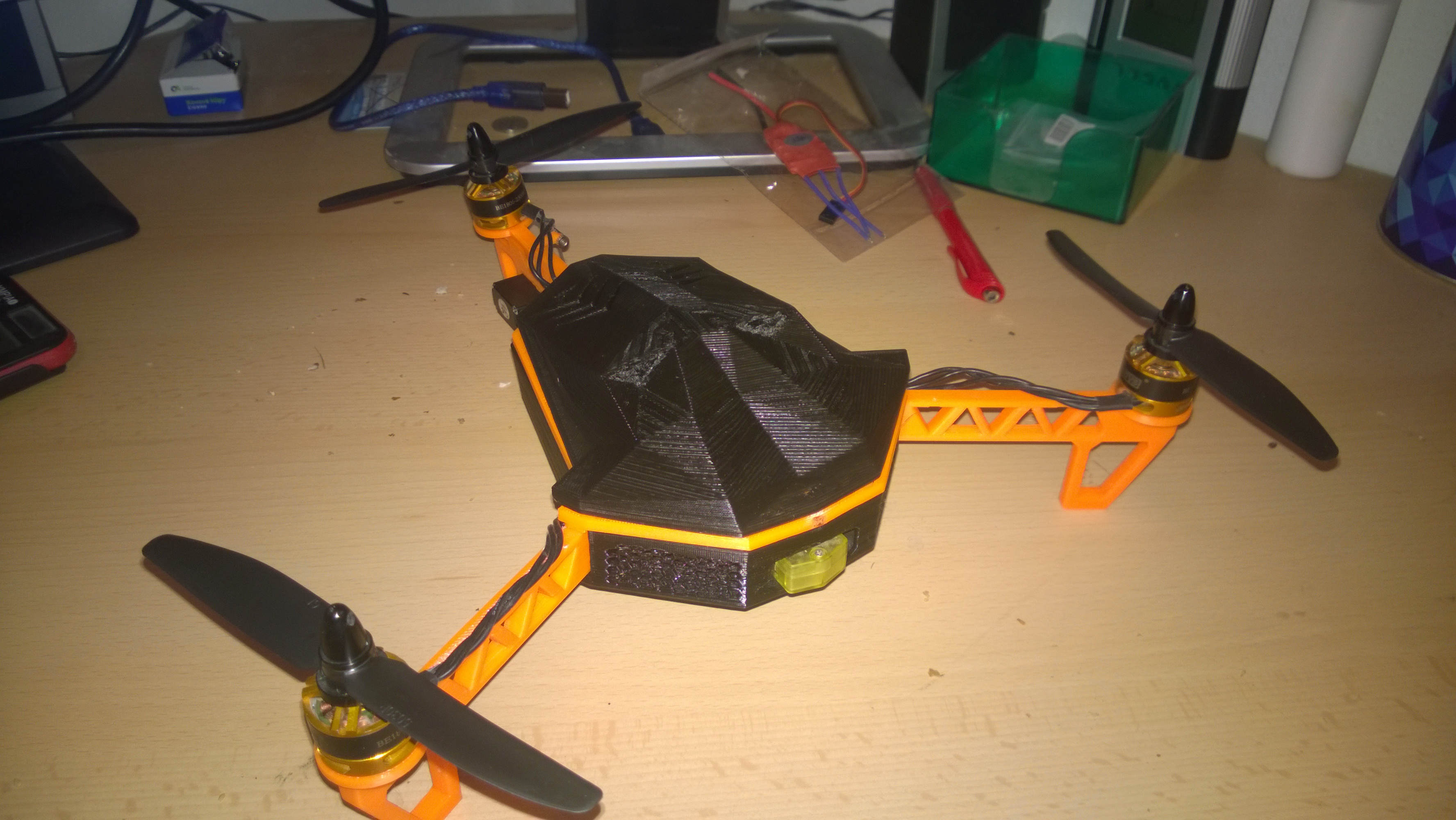 nicméně kopterka je dost těžká a určitě by jí prospěly větší motory (2204-2300kv). s Těma mýma vydží 3 minuty na plný plyn což není nic moc. Mě to na naučení rozhodně stačí ale