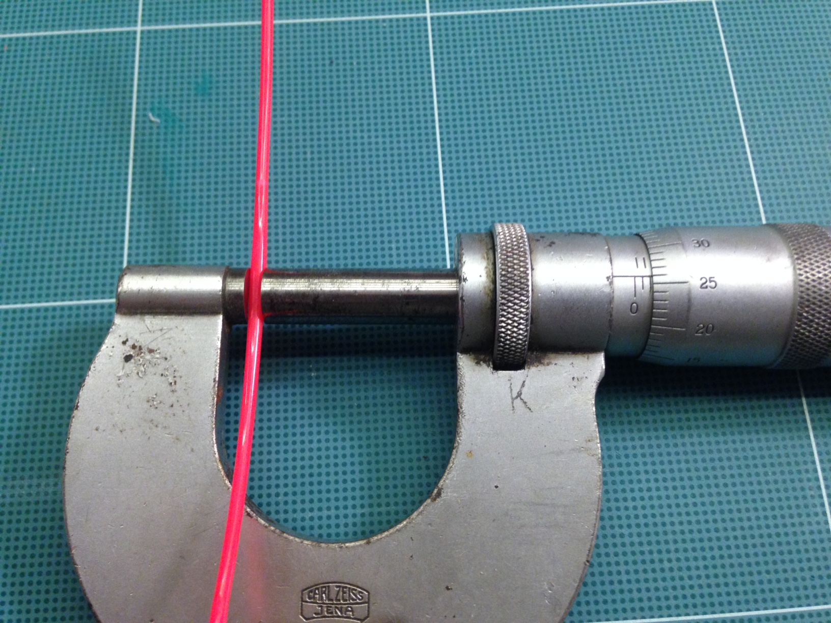Říkám si, že se mi ten hybrid poprvé ucpal. No co se dá dělat. Rozeberu ho, ale vše v pořádku, pouze zuhelnatělý plast uvnitř. Koukám tedy na filament, a je na něm boule 2.26 mm!!! A o půl metru dál další. Vymotal jsem asi 5 metrů, ale už v pohodě. Je to červené PLA Fillamentum.