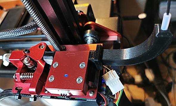 Vše je vytisknuto s PLA. Oblouk se dá naležato vytisknout bez podpor. Hlavní část pochopitelně s podpěrami. Vnitřkem prochází klasická teflonová hadička 4x2mm.