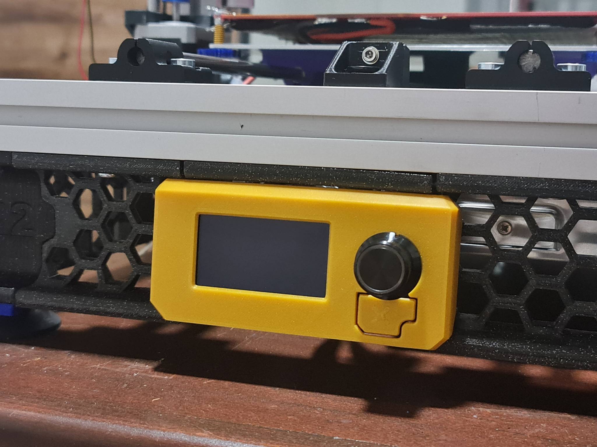 Tak tu zase mame jeden az dva rychle updaty... kryt na LCD 12864 mini jsem nasel na printables, takze jsem na nej jen dodelal jednoduchy uchyt. Bylo nutne upravit uchyt pro napinak, takze ten je taky novej.