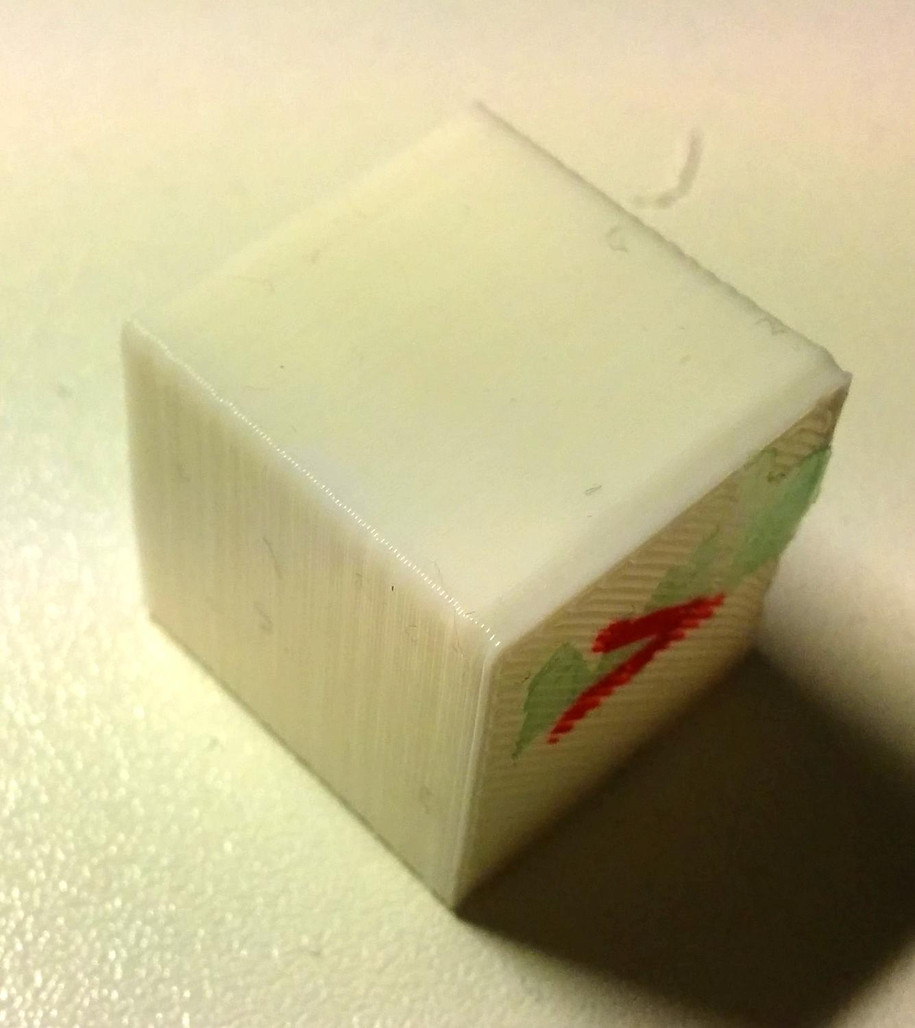 Fotil jsme to mobilem, ty kostky jsem tisk 120mm/sec a nestihlo to chladnout. Ale zajimala mne stena, ne rohy. Vrstva 0.2mm, aby byla v rezonanci se stoupanim 1mm/ot.