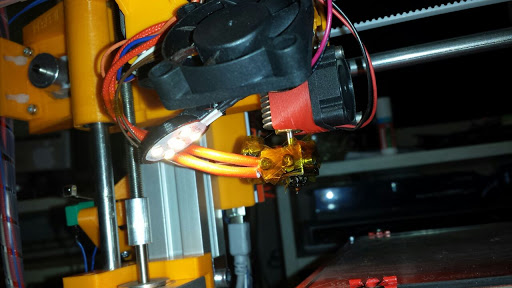 No já jsem tak dlouho spekuloval jak dát pásek abych dobře viděl na tisk, až jsem ho nalepil zespodu na držák hotendu a protože jsem moc líný, tak napájím přes původní větrákový výstup. Překvapilo mě jak těch pět ledek svítí