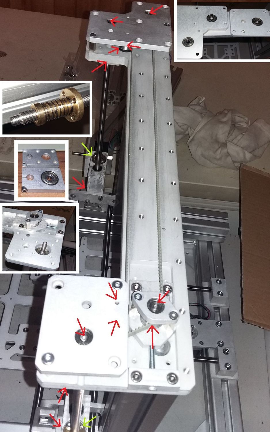 červené šípky označujú uloženia ložísk, zelené sú matice