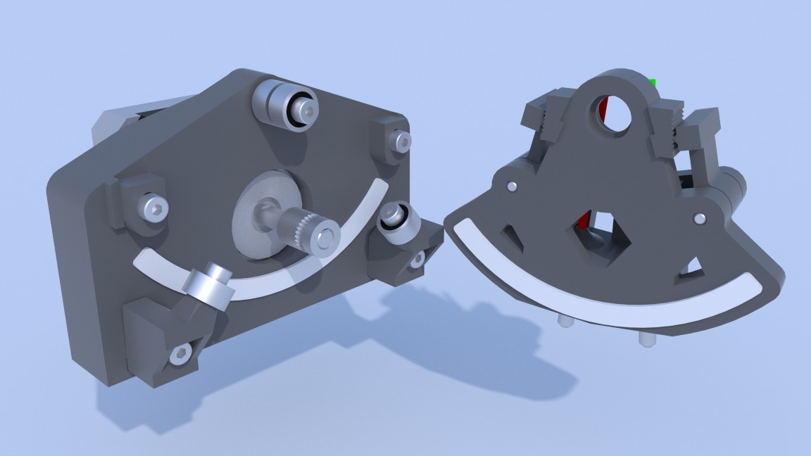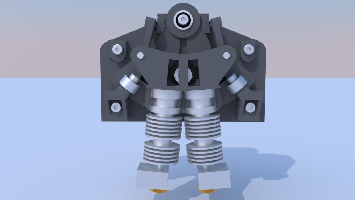 Náklon z pozice prvního extruderu na pozici druhého je o velikosti 10°. To znamená, že tryska by se měla zvednout přibližně o 3-5mm nad tisk (u těch kousků etruderu na obr to dělá 1,5mm). V odkloněních polohách extrudéru budou navíc z plechu udělány plošinky, takže jakmile se přepne na druhý extrudér, nepoužívaný extrudér se odkloní a při odklonu tryska najede na tu plošinku a tím pádem zní už nebude samovolně vytékat plast. Vzdálenost mezi tryskami při tisku (nemyslím mezi svislou a nakloněnou, ale mezi oběma ve svislé poloze) je 10,7 mm.