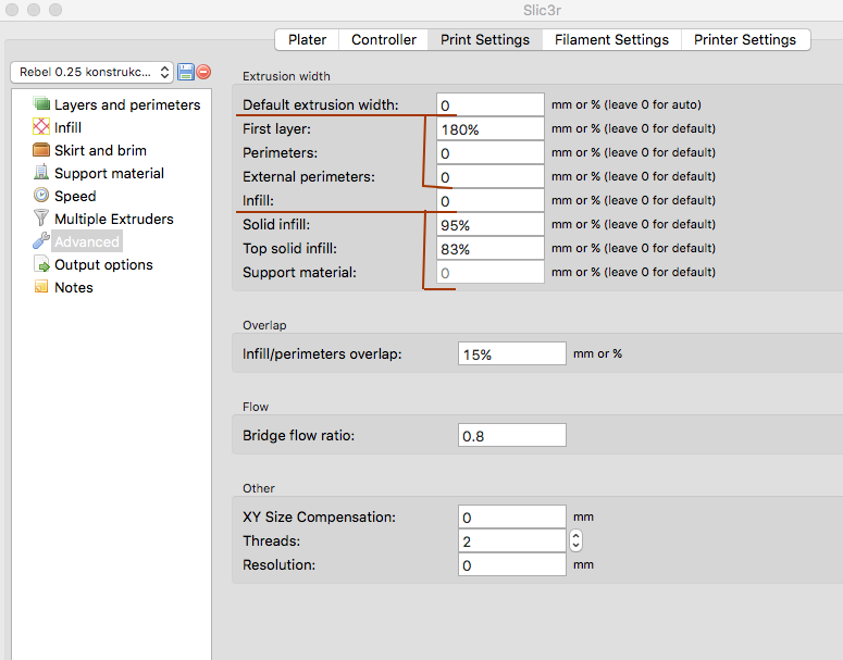 Jinak než jsem dosáhl použitelných výsledků několikrát jsem celé nastavení Slic3ru komplet mazal a začínal od začátku.