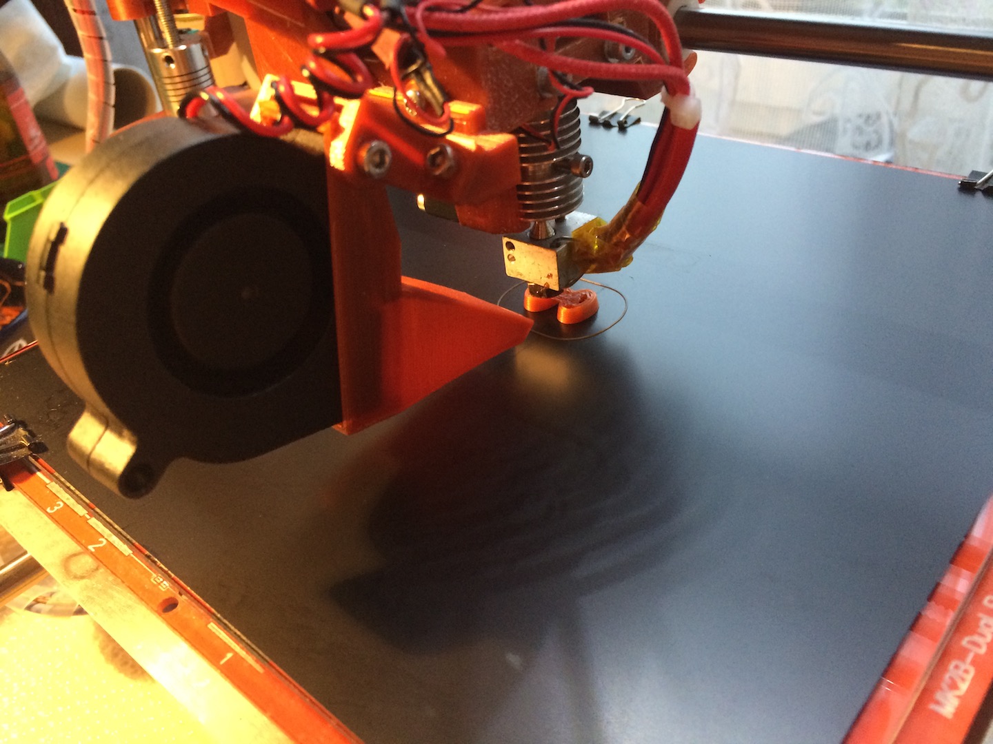 Nefouka, je to nastavene tak aby to foukalo kousek od ni, pruhledem skrz ty ofuky zkotrolovano i vizualne. Krom toho, daji se v nejakem rozmezi stelovat nahoru a dolu. Rychlost samozrejme reguluji, je to zapojene na port druheho hot endu a nastavene ve firmware. Kdyz bude potreba tak to premaluji a ty ofuky prodlouzim, to neni problem.