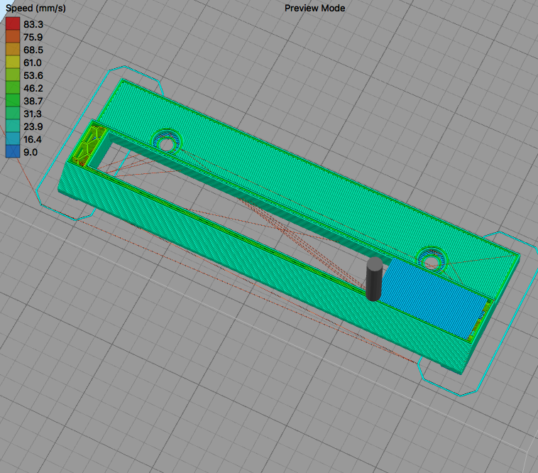 Jelikož je to dutý, tak tisk na podporách. Jenže Slicr mě vygeneroval minimum podpor a z nějakýho neznámýho důvodu tiskne první vrstvu nad podporama jako podélný mosty. To je nepoužitelný, mosty bez podpory dlouhý cca 107 mm. Kdyby tisknul mosty napříč, tak jsou dlouhý jen 12 a 16 mm, to by se vytisklo bez problémů.