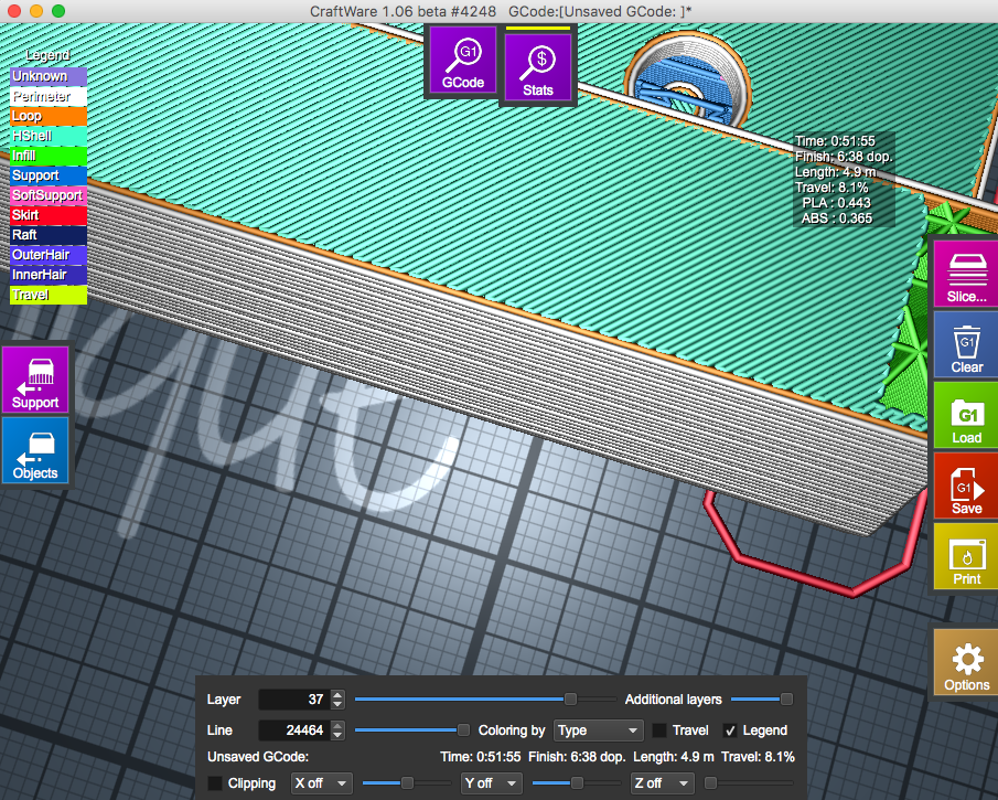 Resim to tak, ze si podpory na model maluju sam. Vetsinou na sirku trysky, ale na zakladnu vzdy alespon 0.5 - 0.6 mm jinak mi to i ty rucne namalovane podpory tiskne az v druhe vrstve tedy ve vzduchu, neresil jsem to, problem jsem obesel rucnim zesilenim prvnich tri vrstev podpor jiz v modelu. Trochu jsem zkousel tisknout na mrizku, ale protoze ji take kreslim rucne, musim pokazde vymazat pruniky apod. tak jsem v tom moc nepokrocil.
