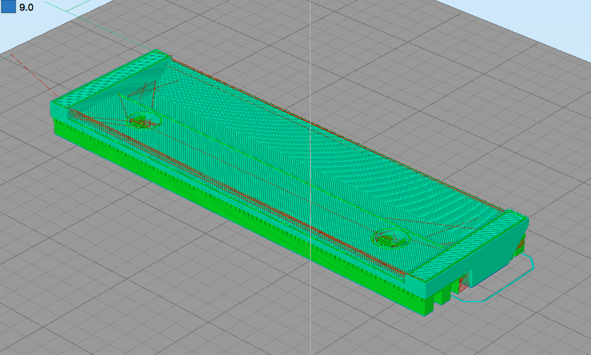 Jelikož je to dutý, tak tisk na podporách. Jenže Slicr mě vygeneroval minimum podpor a z nějakýho neznámýho důvodu tiskne první vrstvu nad podporama jako podélný mosty. To je nepoužitelný, mosty bez podpory dlouhý cca 107 mm. Kdyby tisknul mosty napříč, tak jsou dlouhý jen 12 a 16 mm, to by se vytisklo bez problémů.