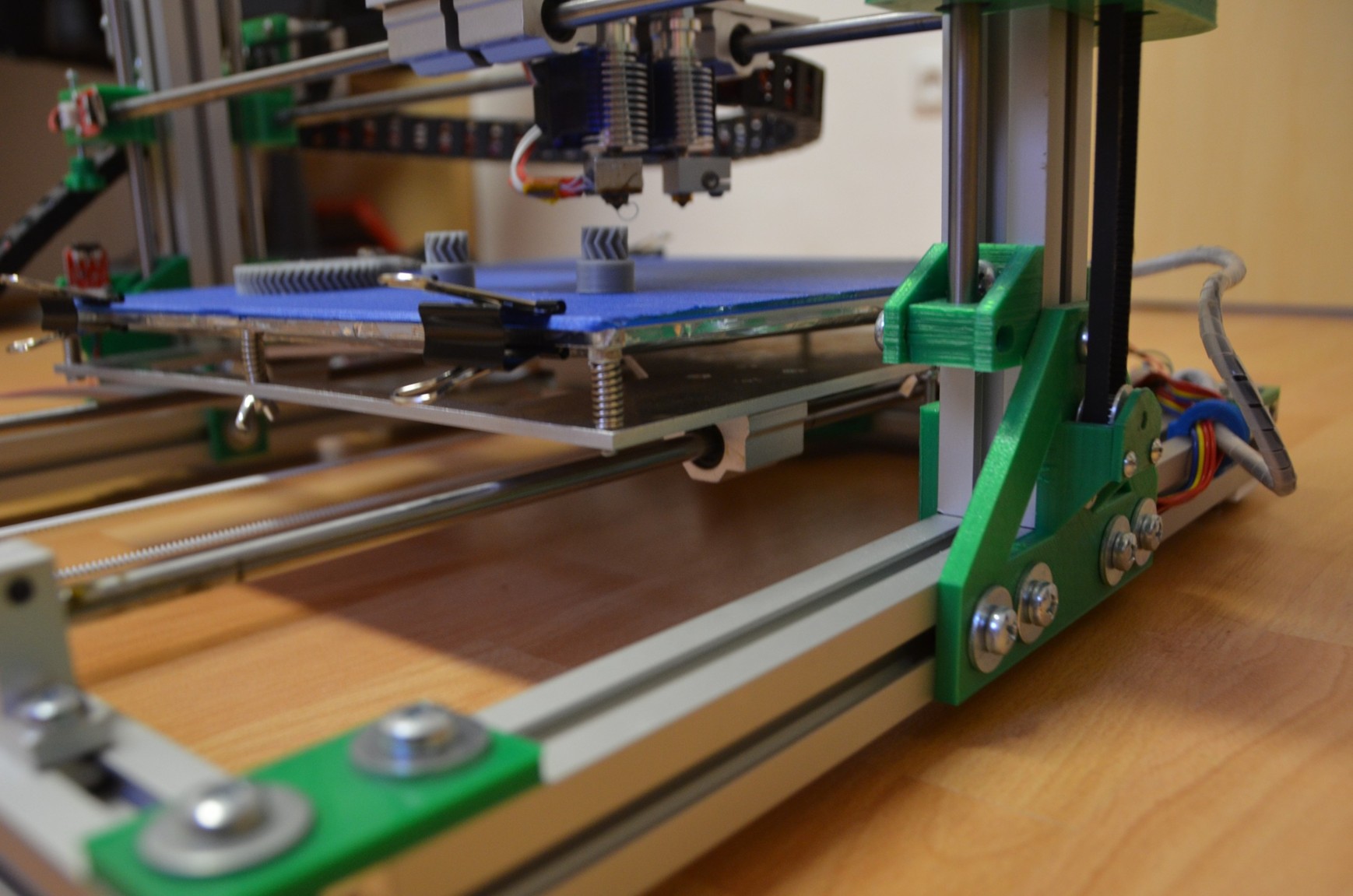 Bed zateplený a vyhřívaný podložkou 240V 750W řízené přes relé z RAMPS 1.4 Tiskárna má ložiska v hliníkových domečcích. Napájení zdroj 12V 450W v hliníku. Kabeláž strukturovaná do robotických pásů.