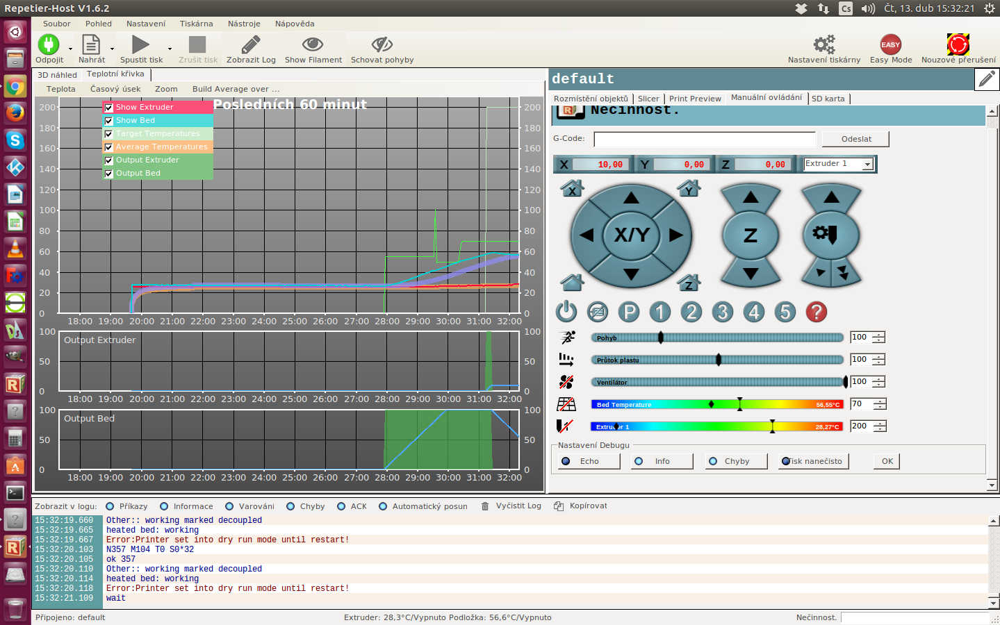 Zdravím, včera jsem dokončil stavbu RebeliX X2. Elektronka je arduino a ramps(vyměněné pojistky a svorkovnice). Nahrál jsem do arduina vzorový FW pro tuto tiskárnu a přes Repetier jsem zkoušel z PC tiskárnu ovládat. Všechny osy fungovaly, odezva na kod M119 koncáků také, ventilátor také fungoval na moje ovládání. Dneska chci pokračovat a nastavovat dál. Tiskárnu zapnu a žádný motor se netočí, ramps svítí, termistory ukazují teplotu(i reálnou). Ale nic nefunguje. Pokud zkusím zapnout nařívání, začne teplota stoupat a tak po 3°C se zastaví a vyskočí hláška v logu "Disabling all heaters due to detected sensor defect." Do ramps mi jde ze zdroje na obou větvích 12.15V. Co zkontrolovat dál? Čím to může být? Díky