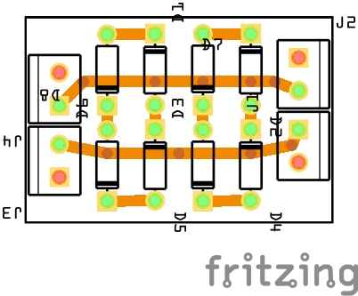 Jen si tak říkám, kde asi chlapci z Fritzingu udělali chybu, když jim to po zadání přesného typu součástek (1N5400) vyhodí tišťák na kterém jsou příliš slabé spoje, mimochodem standard 24mil. Upravil jsem na 48mil, vše je v přiloženém balíčku.