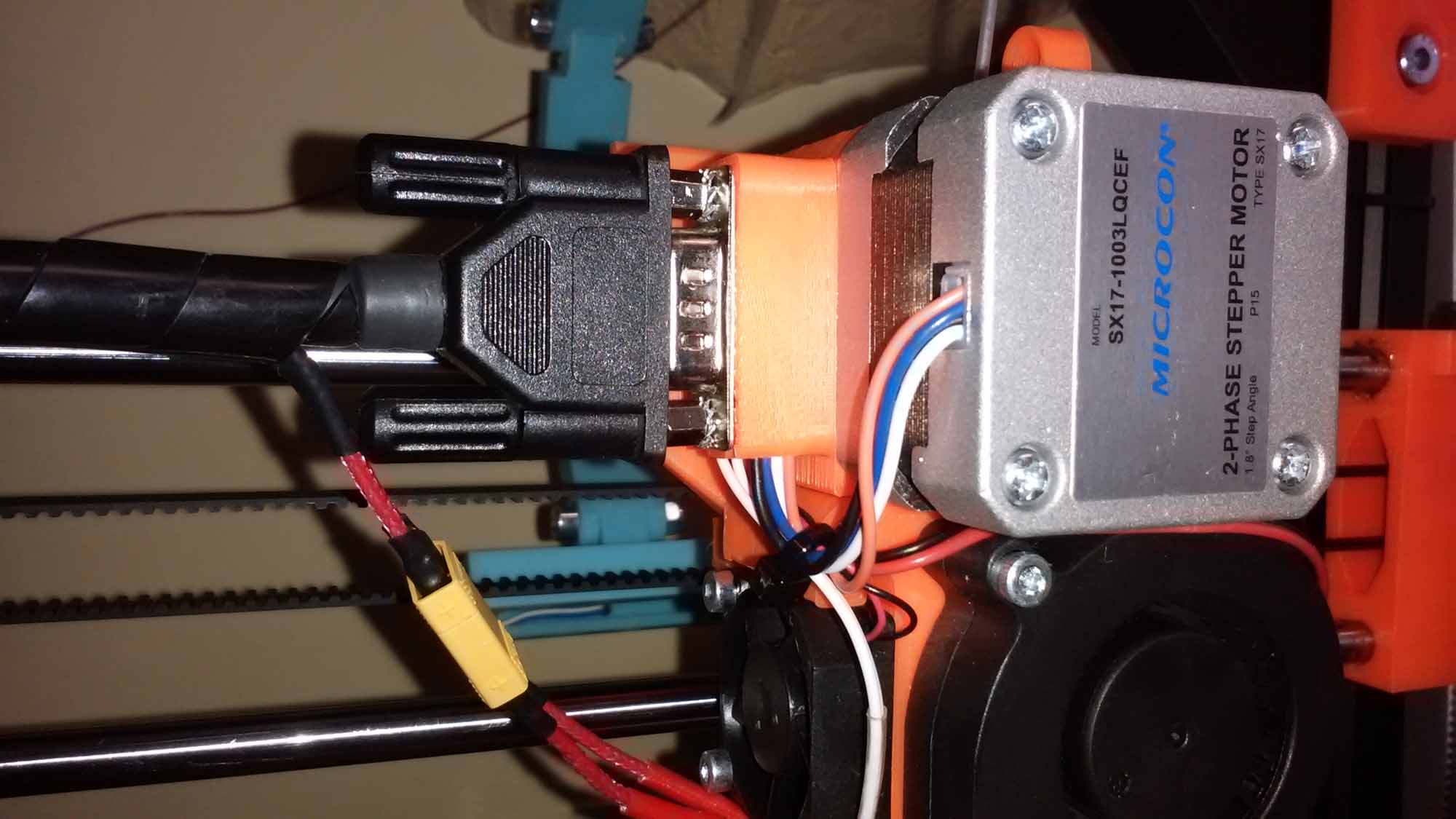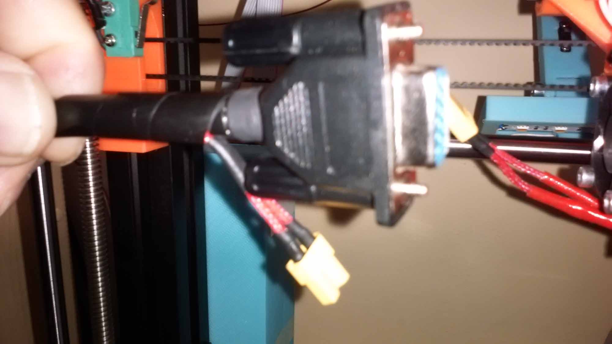 nedávno jsem zrealizoval připojení extrudéru ala Průša od Luboše. Chtěl jsem to mít co nejjednodušší a tak jsem použil konektor Canon15 a na topení XT30. Konektor Canon je přišroubován přes mezikus na extrudéru a topení je odbočeno mimo konektor. Snad nejhorší bylo najít krátkou krytku na Canona. Nakonec jsem rozdělal nějaký kabel z něhož se krytka dala použít. Je důležité kabely do krytky dobře upevnit a vyztužující strunu zavést až do krytky protože tady má kabel dost pohybu. Kabely na vstupu jsou ke krytce uchyceny kouskem smršťovačky. Canon 15 má katalogově 1,5A. Přesto jsem dráty k motoru zapojil přes dva kolíky. Ostatní přes jeden kolík. Vypadá to docela obstojně a konektor to v pohodě zvládá. Výměna extrudéru je nyní snadná.