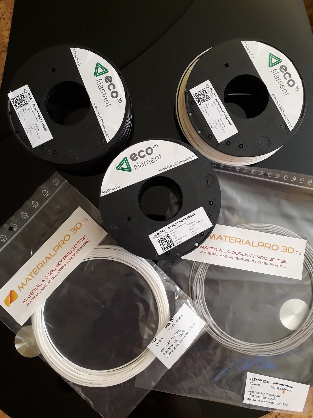 V ceně navíc dvě kaptonové pásky a navíc filamenty: PET-G od Devil design rubínově červená ±0,5 kg, ABS LT od Eco3D filament 1x0,25 kg bílá a 1x0,25 kg černá, PLA od Smartfil – vzorek 10 m bílá, FLEXfill 92A od Fillamentum – vzorek 10 m šedá, PLA od Eco3D filament ±15 m bílá, PET-G od Devil design ±3 m žlutá