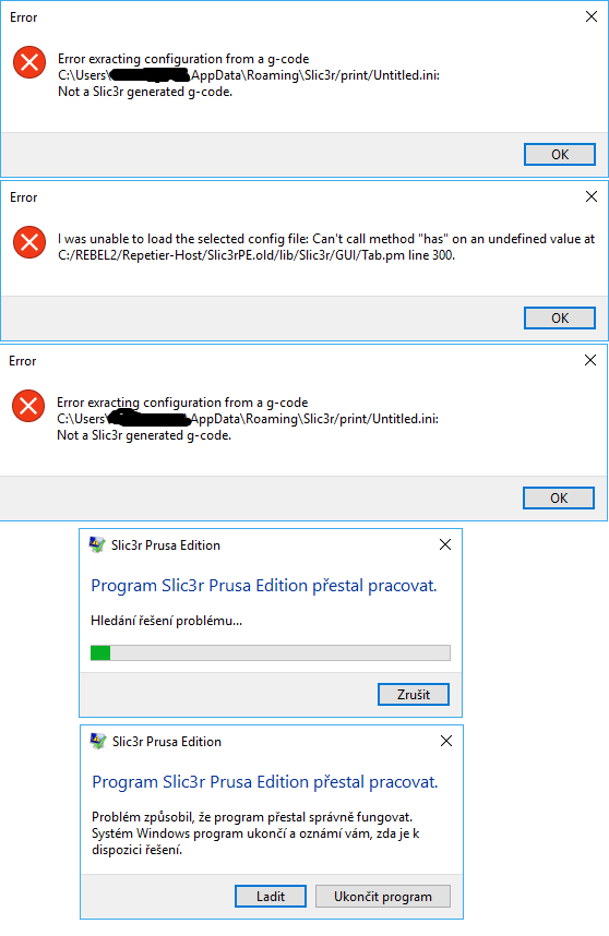 Mě to taky píše chybu po spuštění. Zkoušel jsem to na několika počítačích (Win 10 Pro 64bit CZ se všemi aktualizacemi). Poslední verze, která mi funguje je "1.35.5-prusa3d-win64". Pokud vyzkouším novější tak to probíhá asi takto: